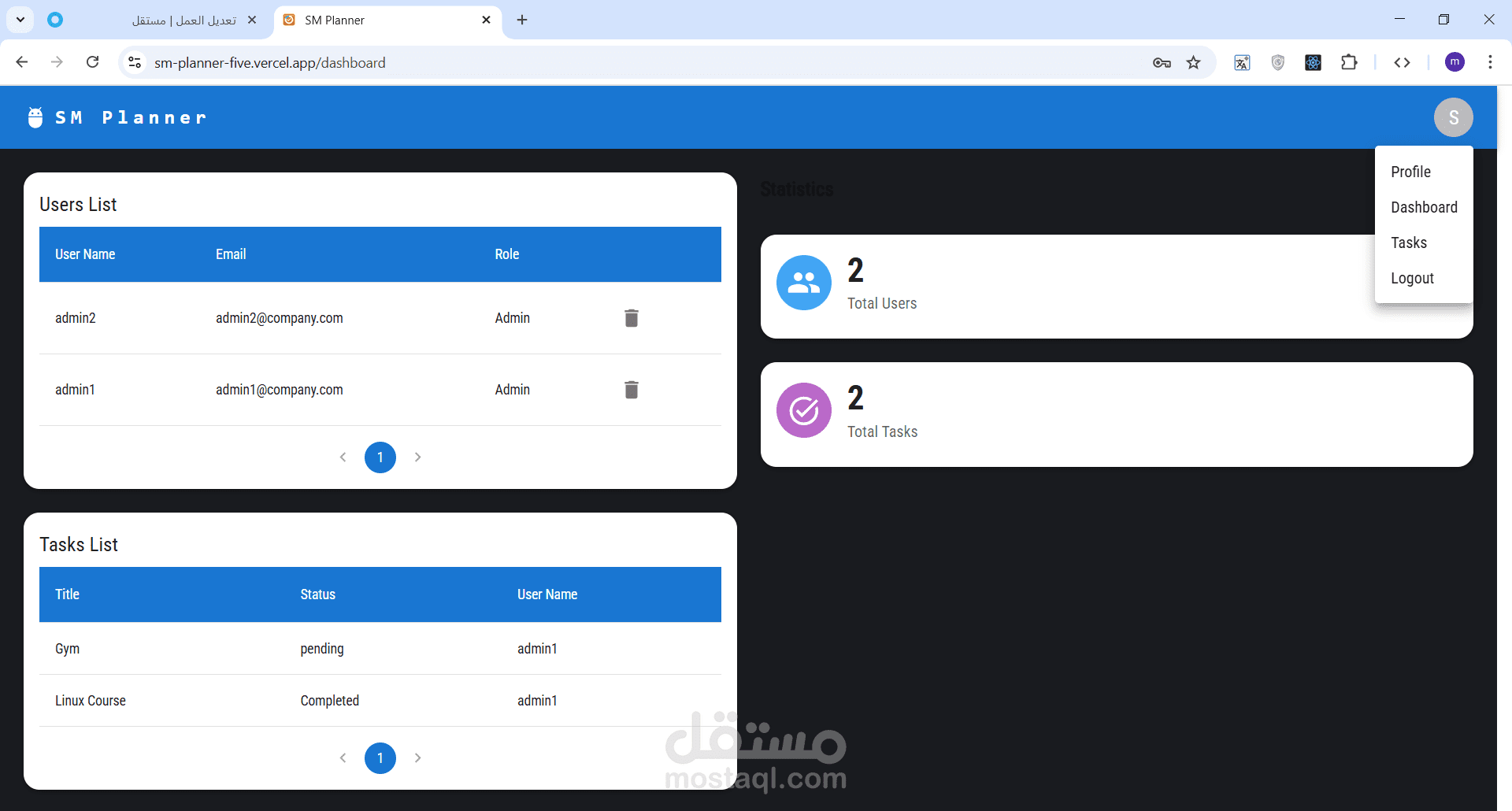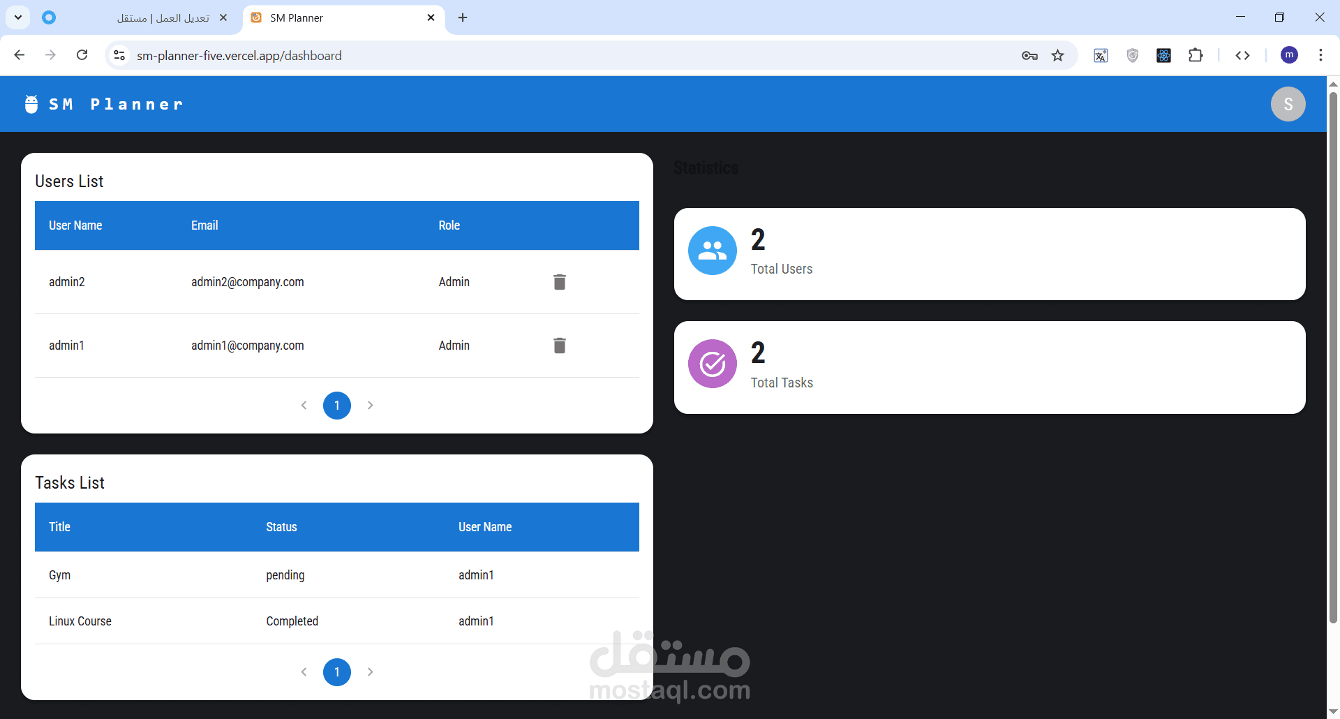 إمكانية إنشاء المهام، تعديلها، وحذفها مع تحكم كامل في الصلاحيات حسب الدور