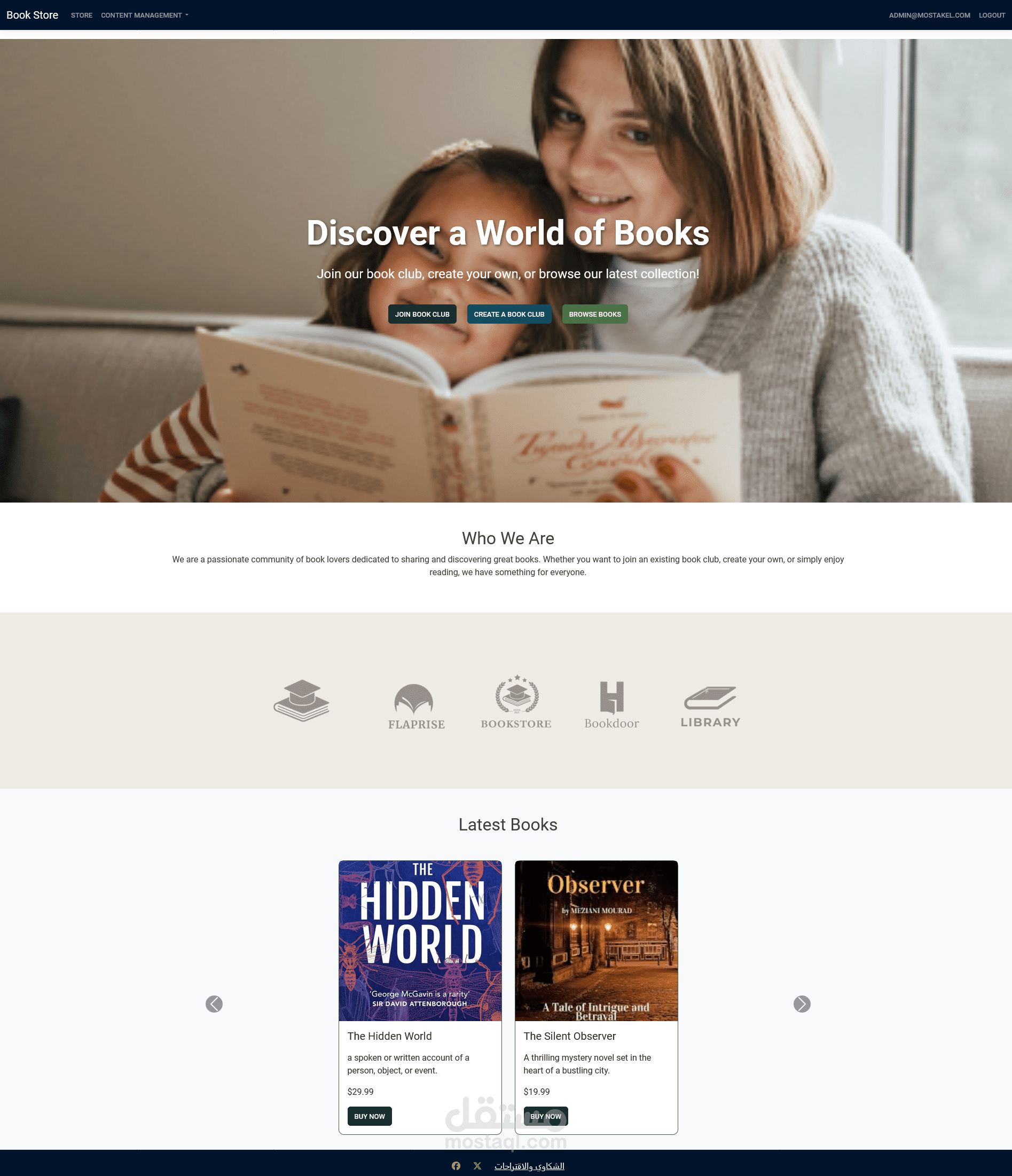 تم تطوير هذا الموقع باستخدام ASP.NET Core لتقديم منصة متكاملة لعشاق الكتب. يمكن للمستخدمين تصفح الكتب وشرائها، بالإضافة إلى الانضمام إلى نوادي القراءة الحالية أو إنشاء نادي قراءة خاص بهم للتواصل مع قراء آخرين ذوي اهتمامات مشابهة. يتضمن الموقع لوحة تحكم شاملة تُمكن المسؤولين من إدارة مخزون الكتب، تتبع المبيعات، والإشراف على نشاط المستخدمين في نوادي القراءة.