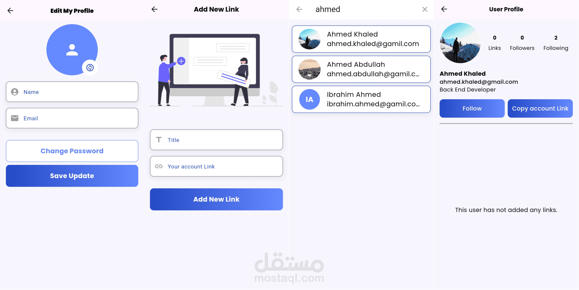عند فتح صفحة المستخدم، يمكنك رؤية جميع الروابط الخاصة به ومتابعته، وبمجرد النقر على أي رابط يتم توجيهك إلى صفحته على التطبيق.