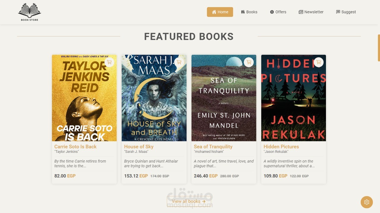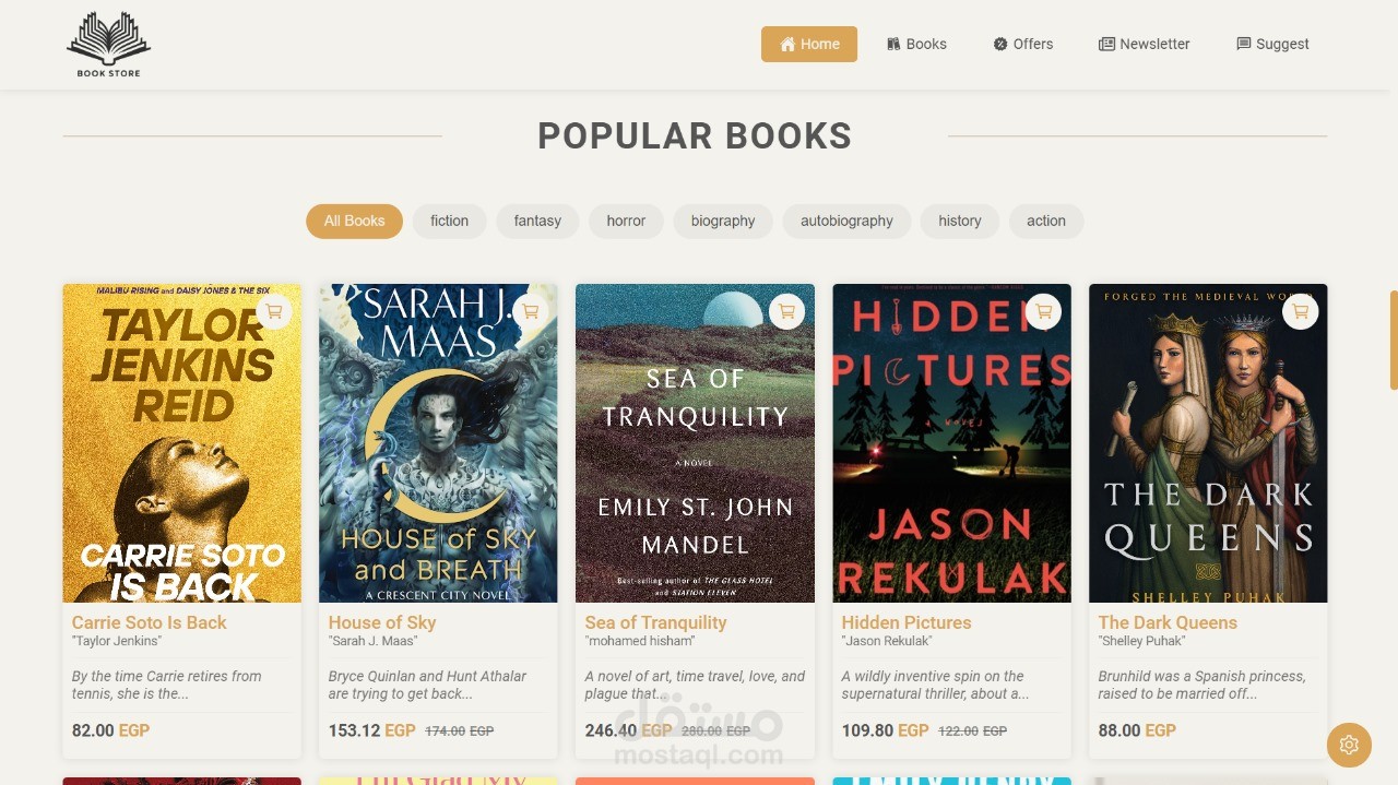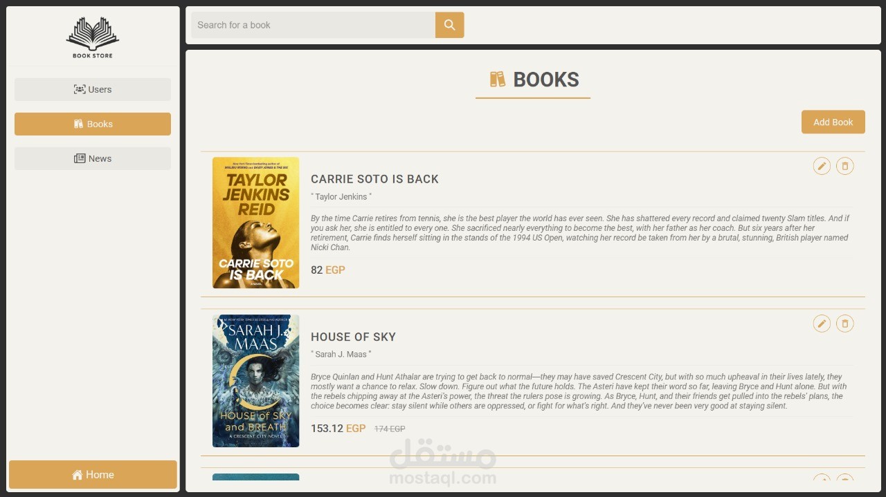 Book Store هو موقع بيع الكتب، طُوّرباستخدام React للواجهة الأمامية وNode.js مع Express للواجهة الخلفية.ومعه لوحة تحكم متقدمة تتيح اللوحة إدارة سلسة للمخزون، وعرض بيانات المبيعات وتحليلات المستخدمين في الوقت الفعلي، مع تقديم إحصائيات شاملة لدعم اتخاذ قرارات ذكية. توفر واجهة سهلة الاستخدام للمشرفين، تشمل تصفية الكتب وتتبع الطلبات وعرض التقارير لمساعدة الموقع على تحسين تجربة المستخدم وزيادة المبيعات.
