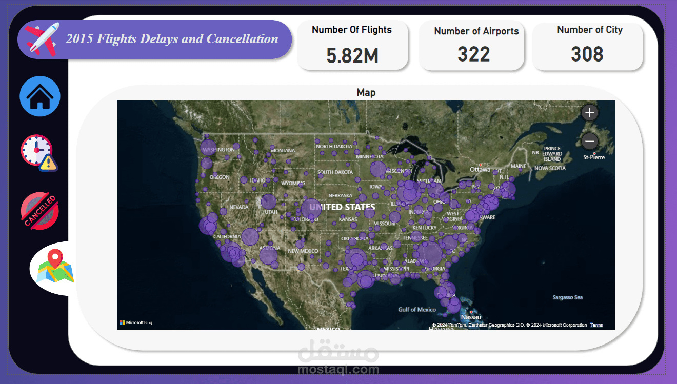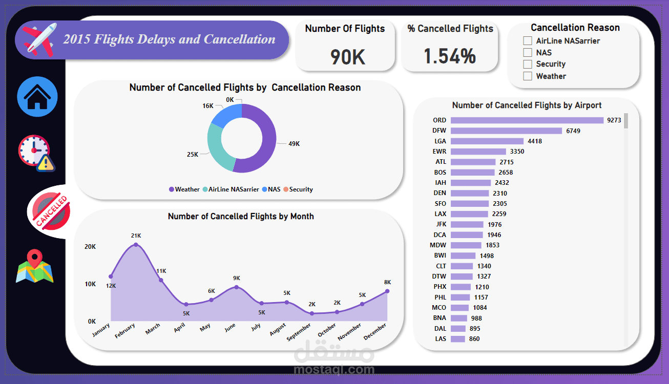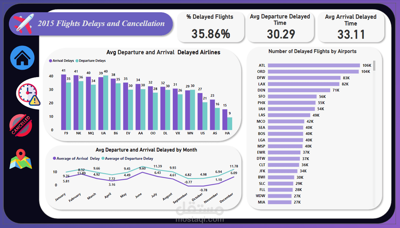 لقد أتممت مؤخرًا مشروع لوحة تحكم باستخدام Power BI لتحليل مجموعة بيانات تأخيرات وإلغاءات الرحلات الجوية في الولايات المتحدة لعام 2015.