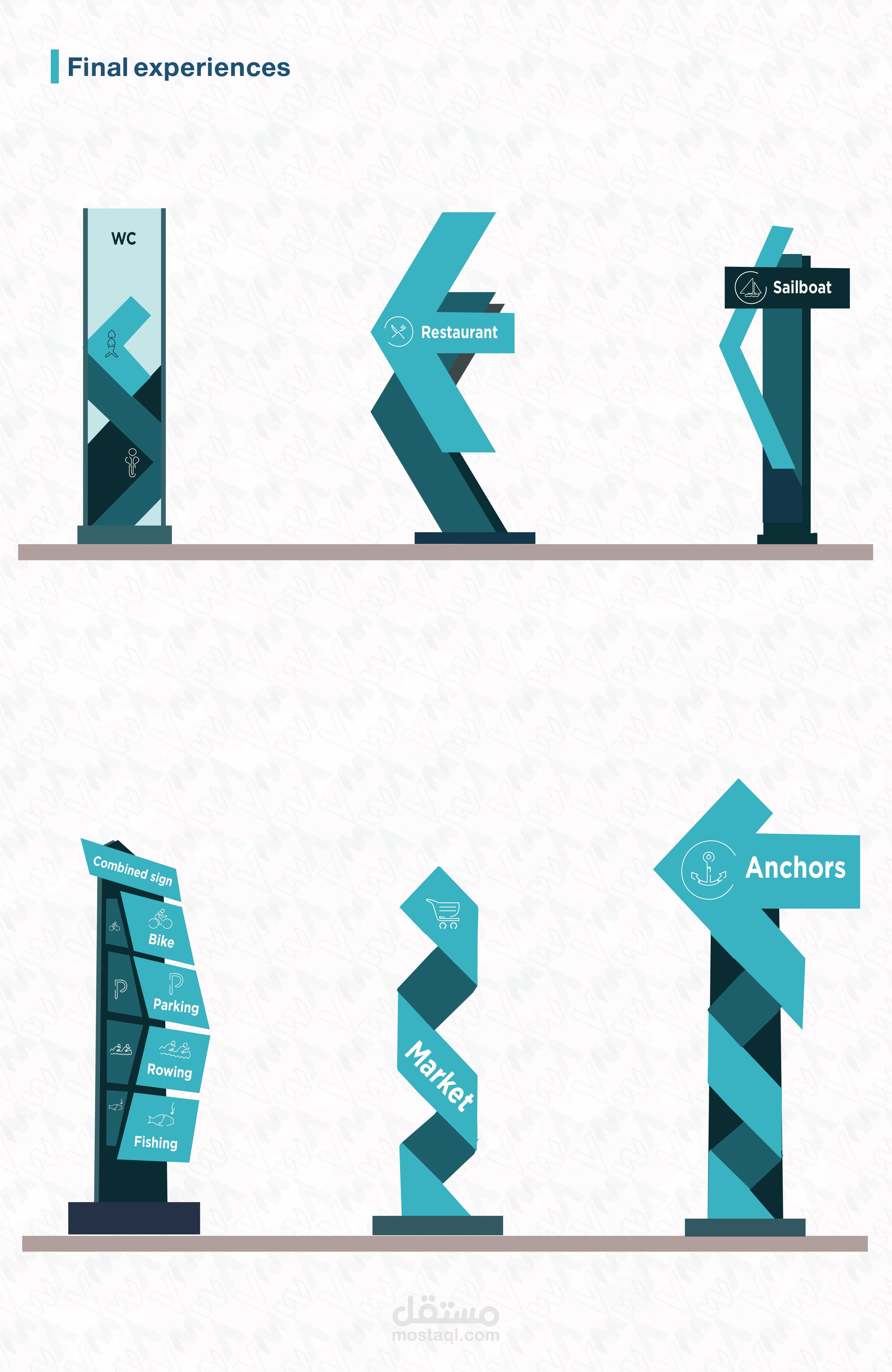 لوحات المعلومات: يجب أن تكون اللوحات الإرشادية واضحة وسهلة القراءة، تشتمل على اتجاهات لجميع المواقع الأساسية في الممشى مثل: دورات المياه، المقاهي، أماكن الجلوس، مواقف السيارات، مناطق الأطفال، والمخارج.