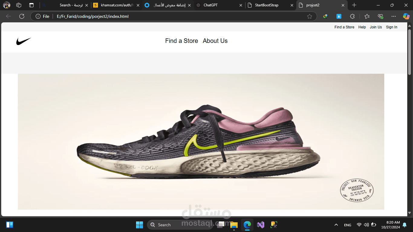 هذا المشروع هو تصميم موقع شبيه بموقع Nike، يركز على إنشاء واجهة نظيفة واحترافية مشابهة للأصلية. يتضمن الموقع شريط تنقل متجاوب يحتوي على روابط أساسية، وقسم رئيسي يعرض منتج Nike بشكل جذاب، مع تصميم بسيط يبرز هوية العلامة التجارية. تم تطوير المشروع باستخدام HTML وCSS، ويظهر مهاراتي في إنشاء واجهات جذابة تركّز على المستخدم وتوفر تجربة تفاعلية عبر الأجهزة المختلفة