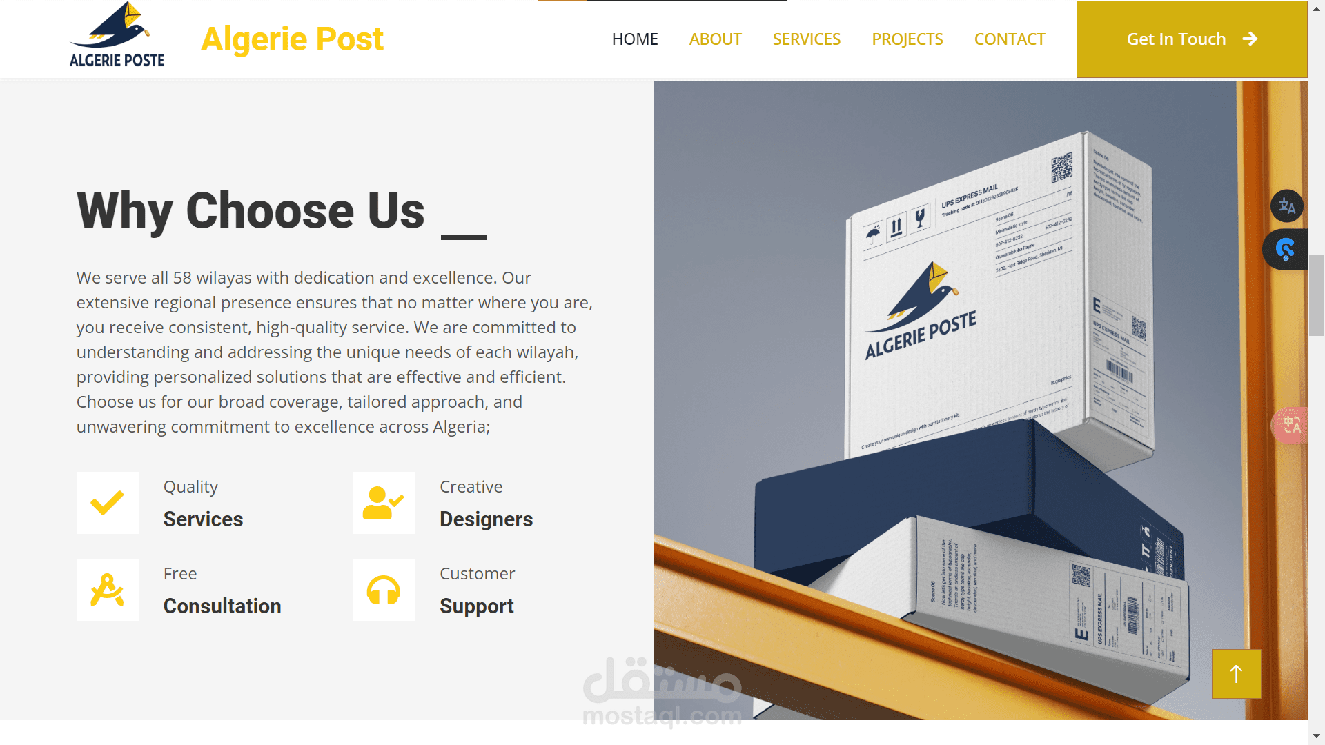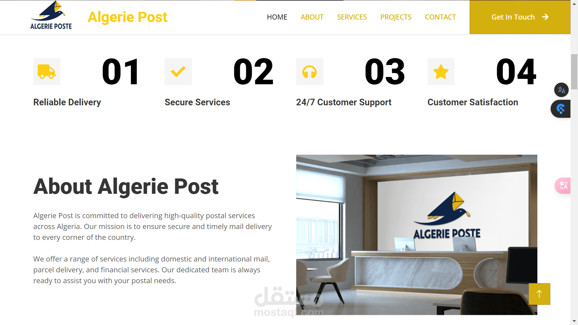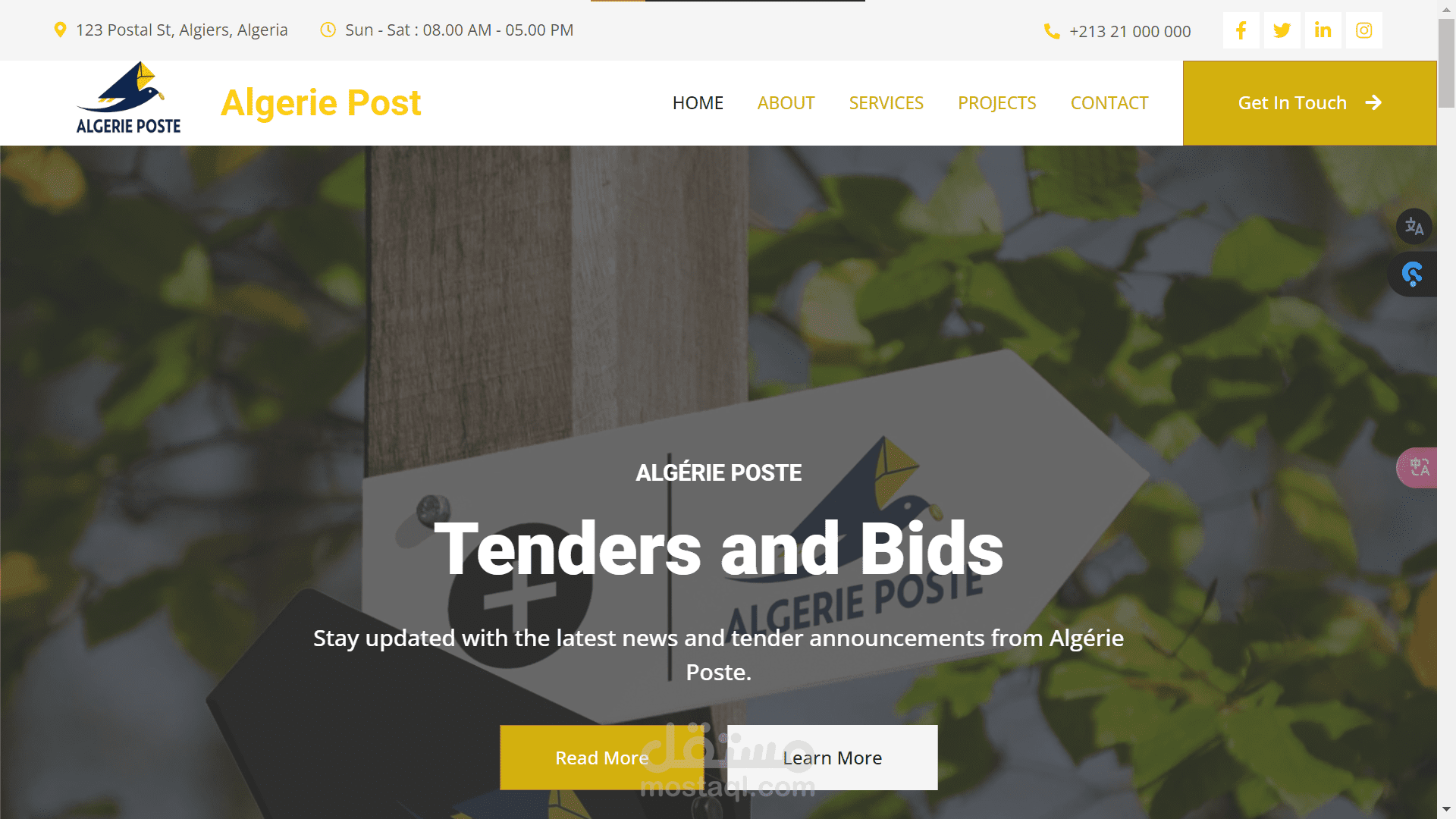 إعادة تصميم لموقع Algérie Poste، الشركة المملوكة للدولة والمسؤولة عن تقديم خدمات البريد في الجزائر، ويقع مقرها في باب الزوار، الجزائر العاصمة. المشروع يشمل تحديثًا شاملاً للواجهة باستخدام تصميم حديث ومتجاوب يتناسب مع مختلف الأجهزة، مع إضافة شعار جديد يعكس الهوية المؤسسية للشركة. الهدف من هذا التصميم هو تحسين تجربة المستخدم وتسهيل الوصول إلى الخدمات البريدية، بالإضافة إلى تقديم مظهر بصري يعكس التطور والابتكار في خدمة العملاء