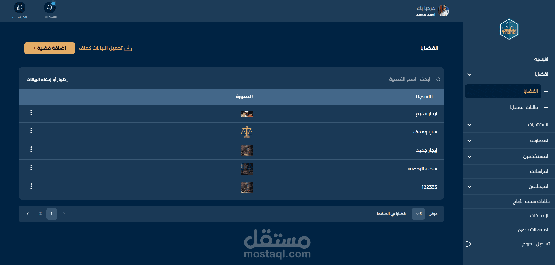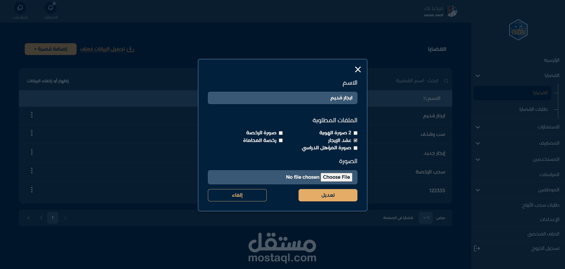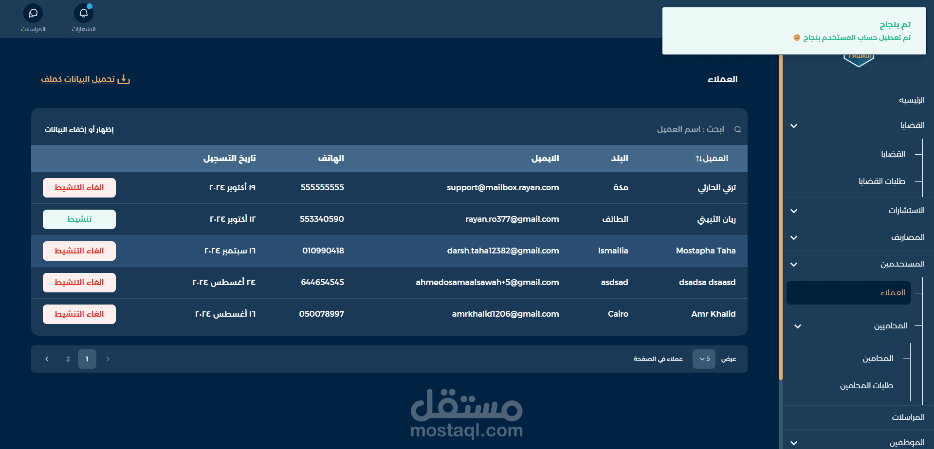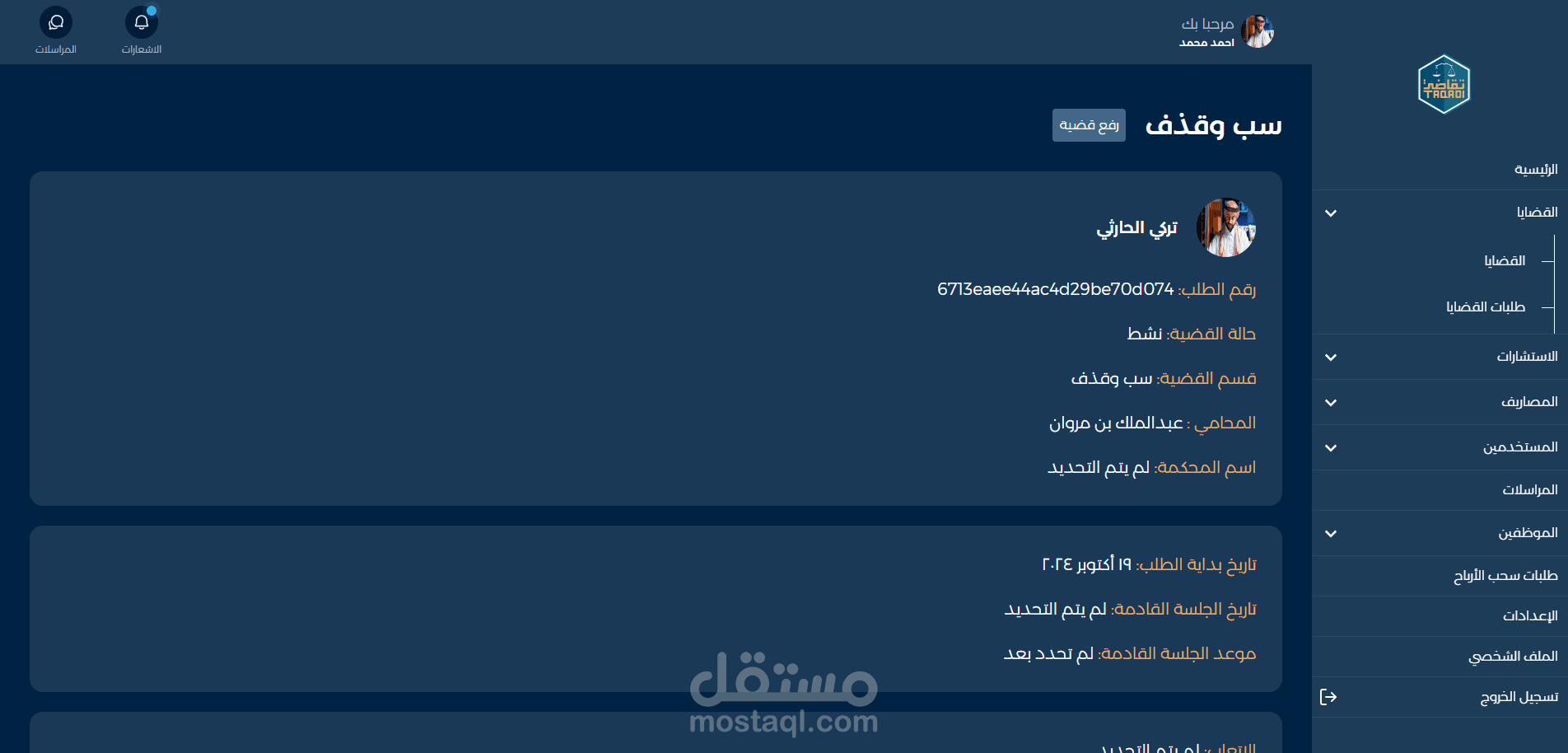 مشروع لوحة تحكم لمنصة شركة محاماه بالمملكة العربية السعودية