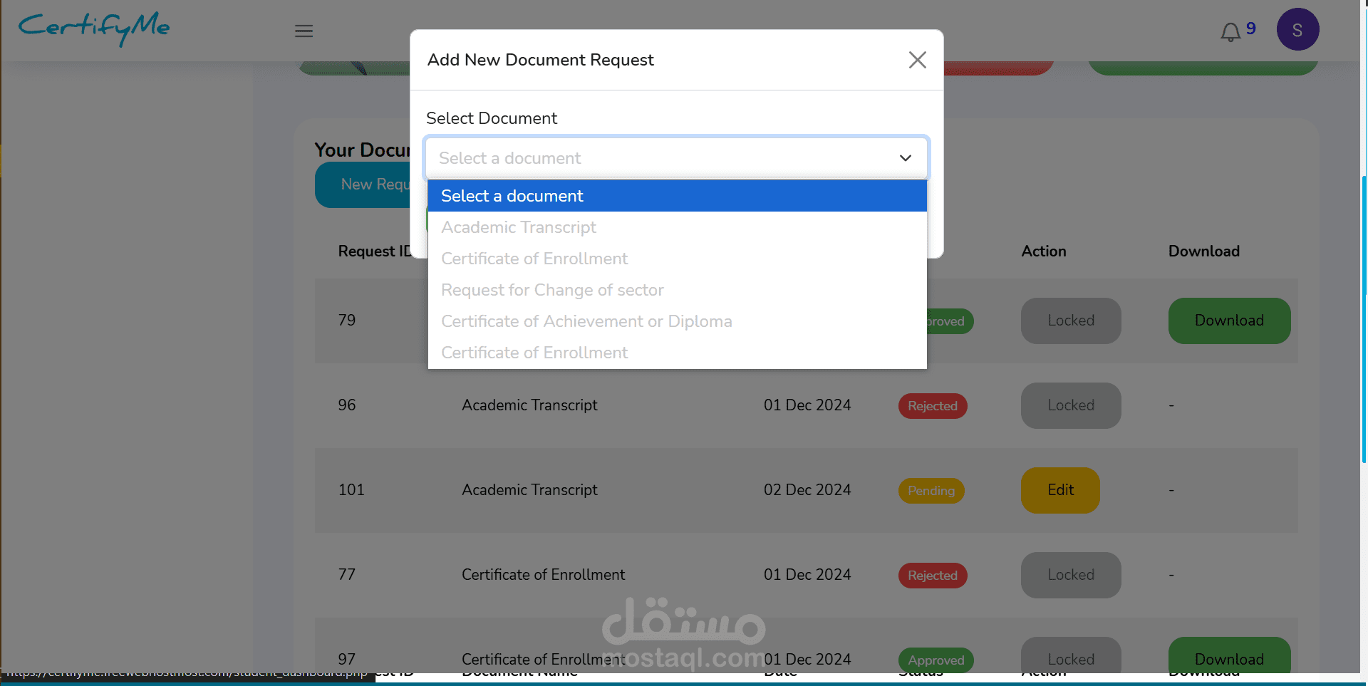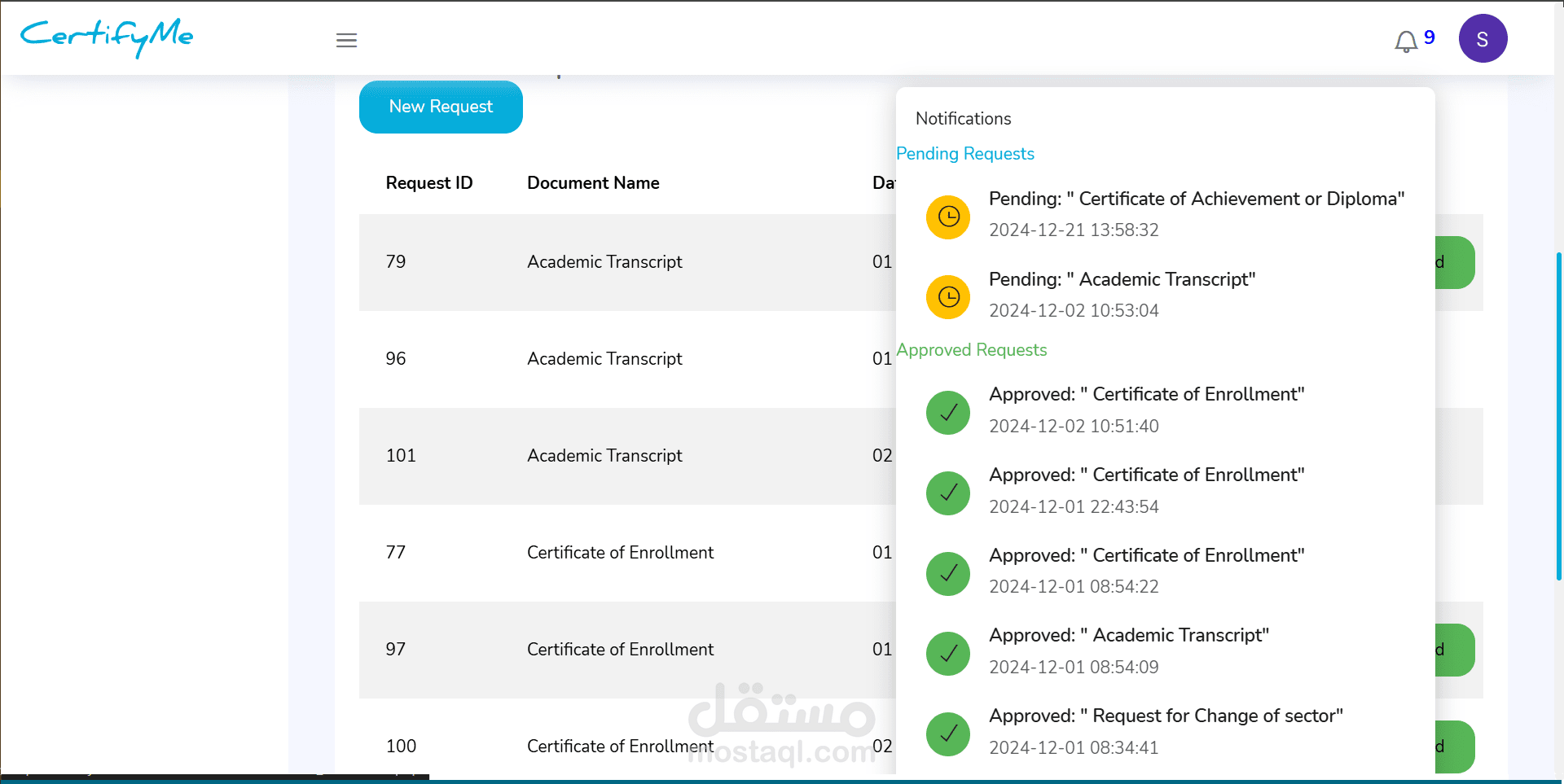 **CertifyMe** هو نظام رقمي متكامل لتسهيل إدارة طلبات الوثائق الجامعية، مثل **شهادة التسجيل** و**شهادة حسن السيرة**، حيث يوفر واجهة تفاعلية تتيح للطلاب تقديم الطلبات وتتبعها إلكترونيًا دون الحاجة إلى زيارة المكاتب الإدارية.