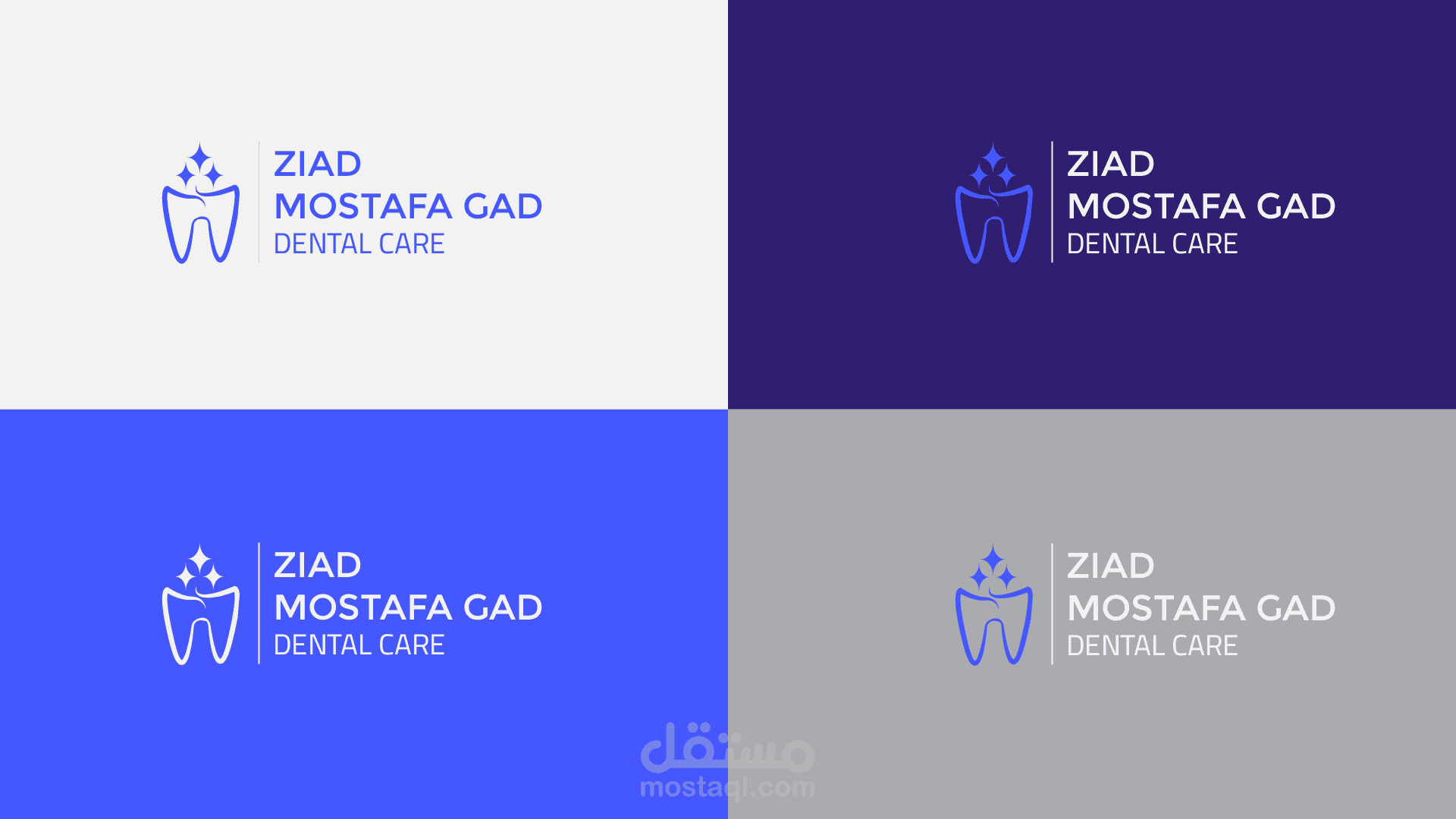 الألوان: تم اختيار درجات اللون الأزرق والبنفسجي لتعكس الهدوء والثقة، وهي ألوان تعزز الشعور بالراحة لدى المرضى وتعكس بيئة العيادة الاحترافية. كما يتم استخدام درجات متباينة من اللون لتناسب خلفيات مختلفة، مما يضمن وضوح الهوية في أي سياق.