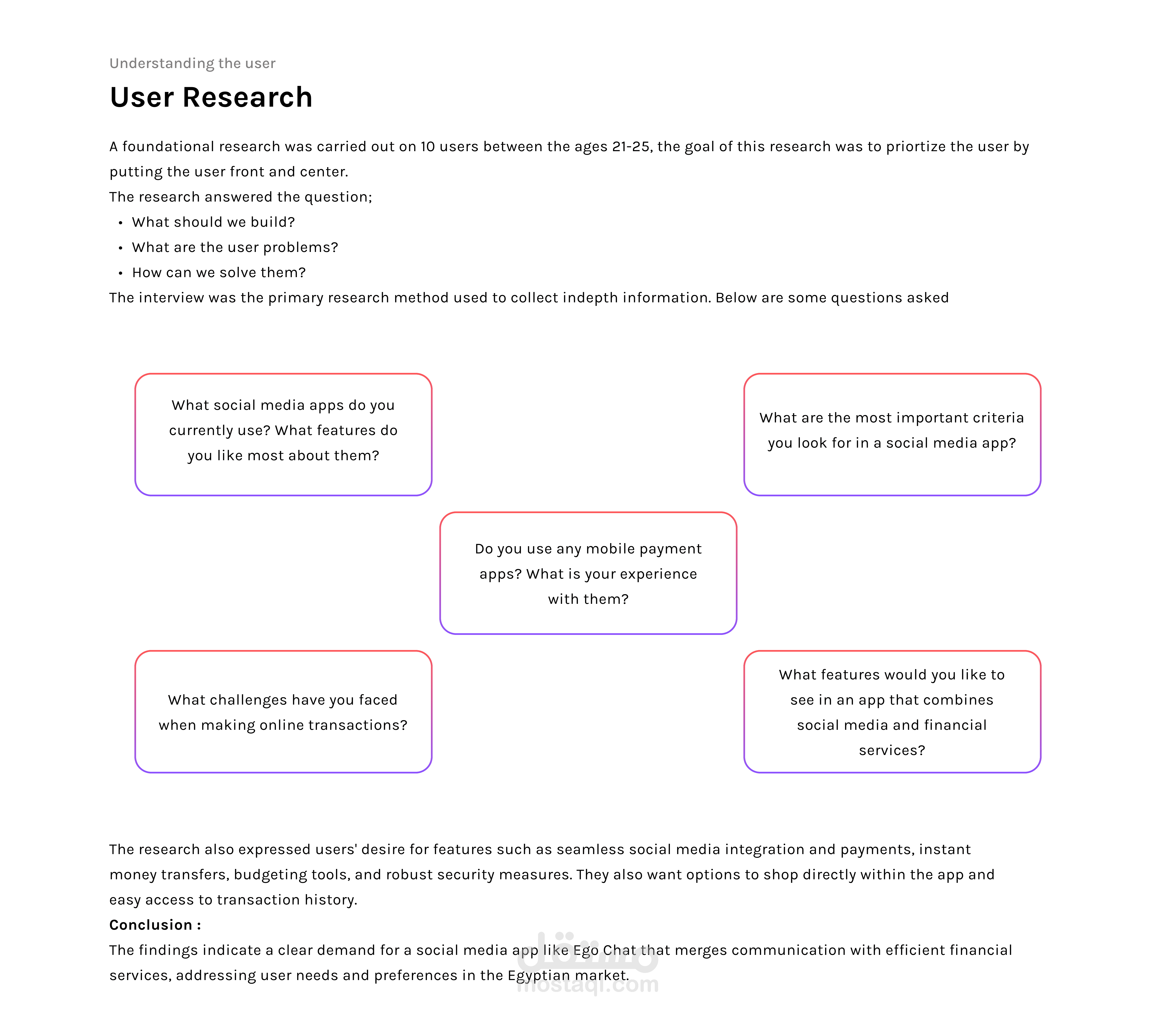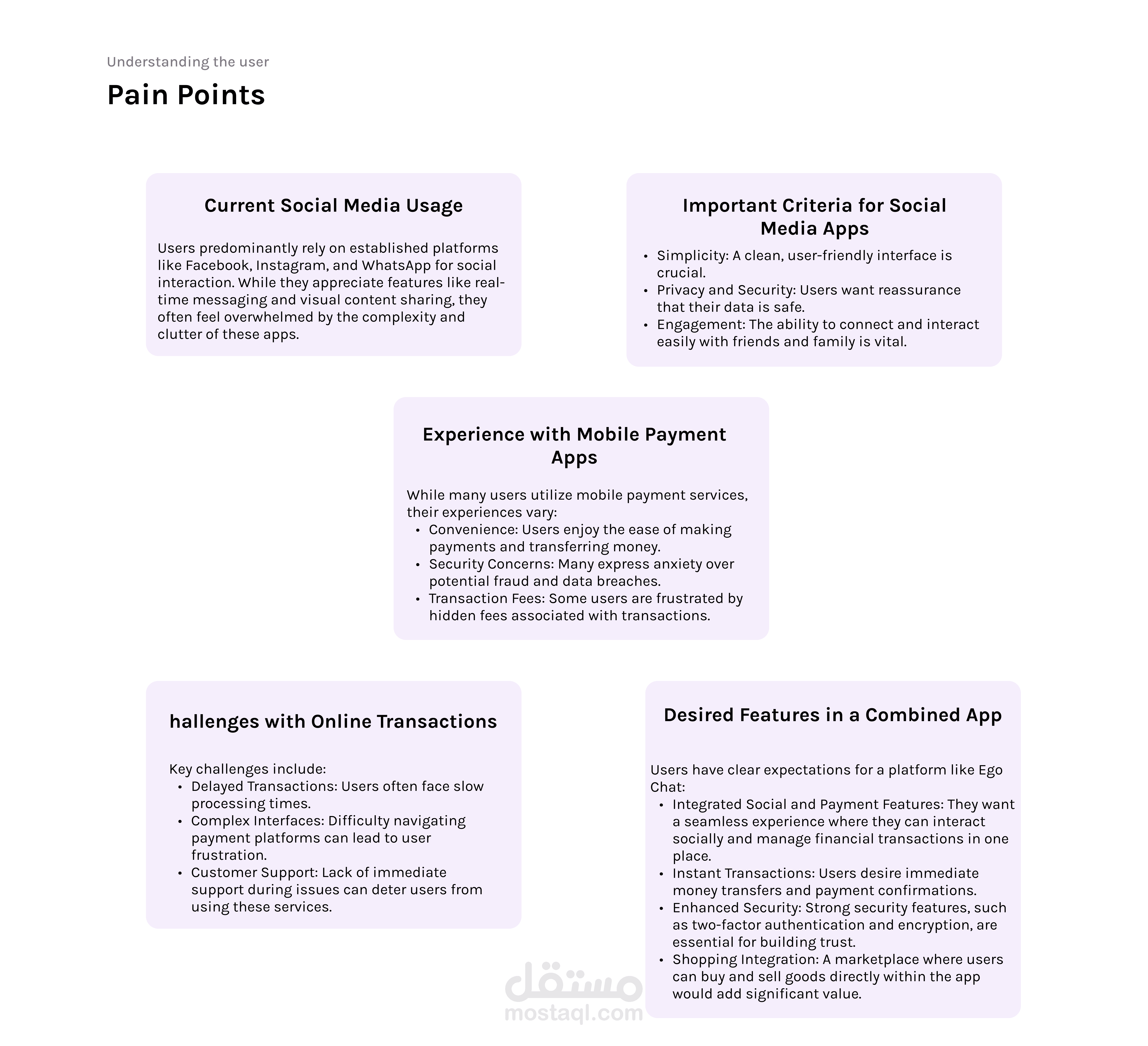 أحد التحديات التصميمية الأساسية في مشروع Ego Chat هو دمج الخصائص الاجتماعية مع الخدمات المالية دون أن يشعر المستخدم بأنه يتعامل مع تطبيقين منفصلين.