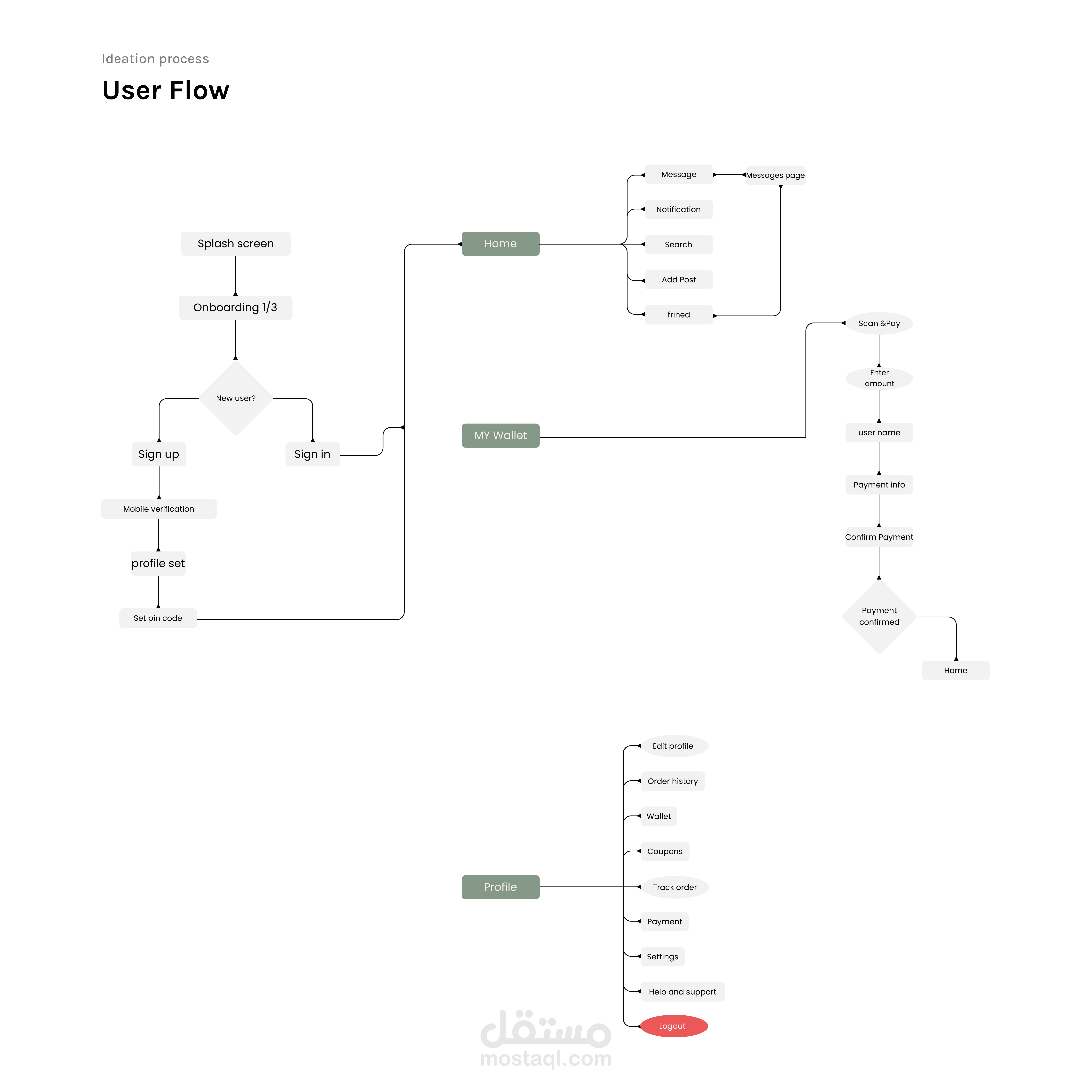 - User Flow Diagrams – لتحديد السيناريوهات الأساسية لحركة المستخدم