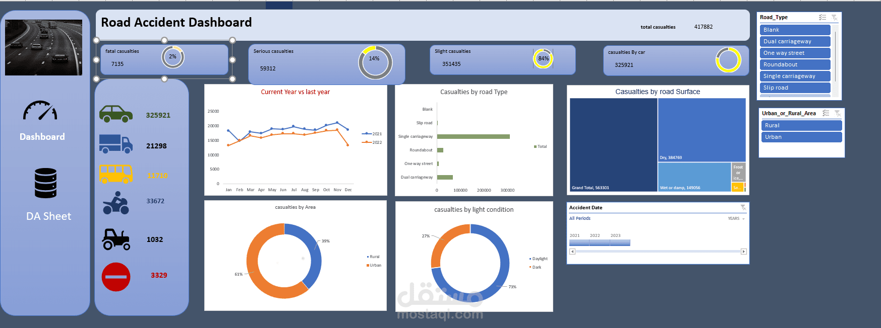 مخططات دائرية: توضح النسب المئوية لأنواع مختلفة من الحوادث (مثل أنواع المركبات، ظروف الإضاءة).