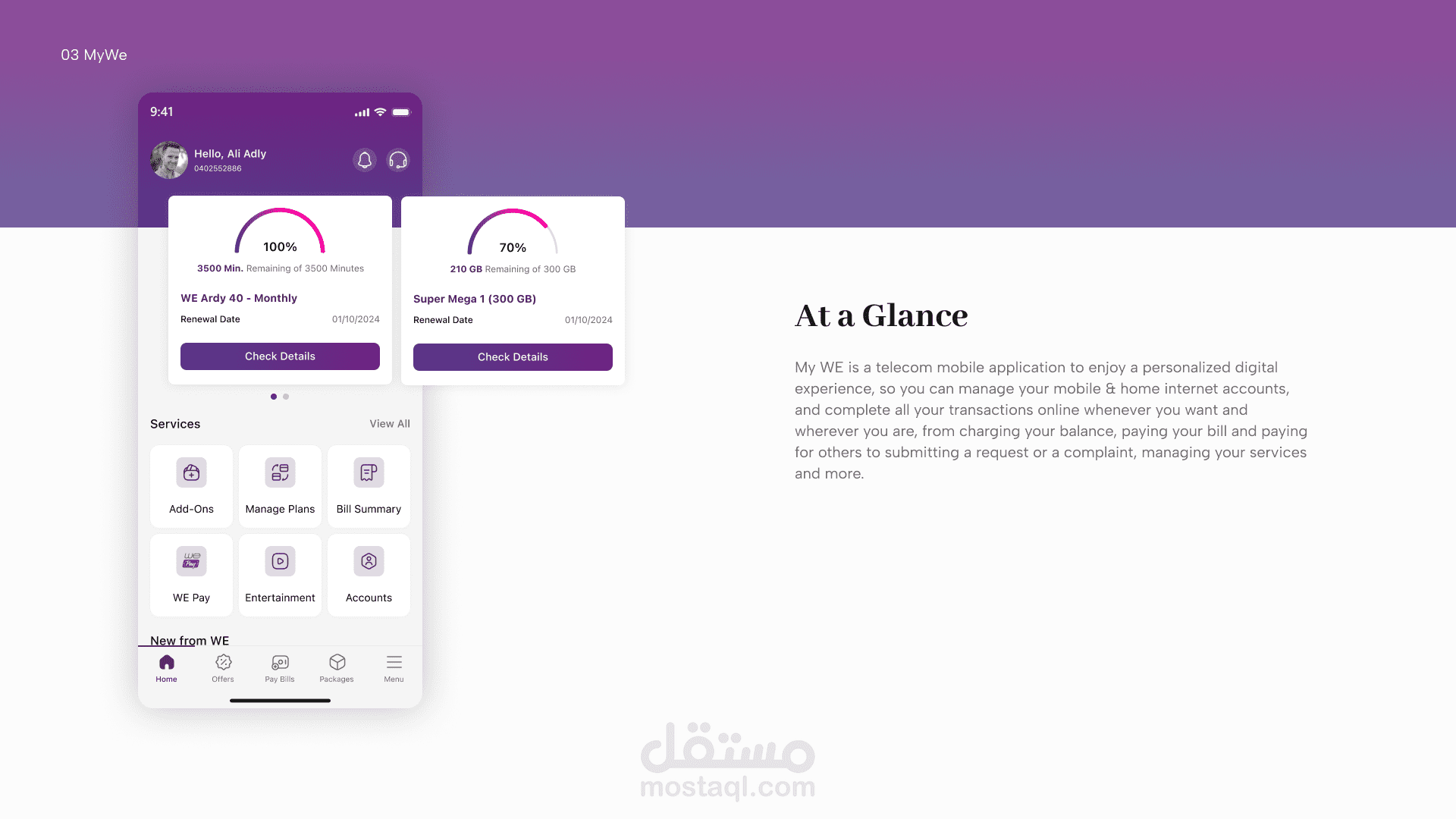 My WE هو تطبيق للهاتف المحمول يهدف إلى تقديم تجربة رقمية مخصصة لإدارة حسابات الهاتف المحمول والإنترنت المنزلي.
