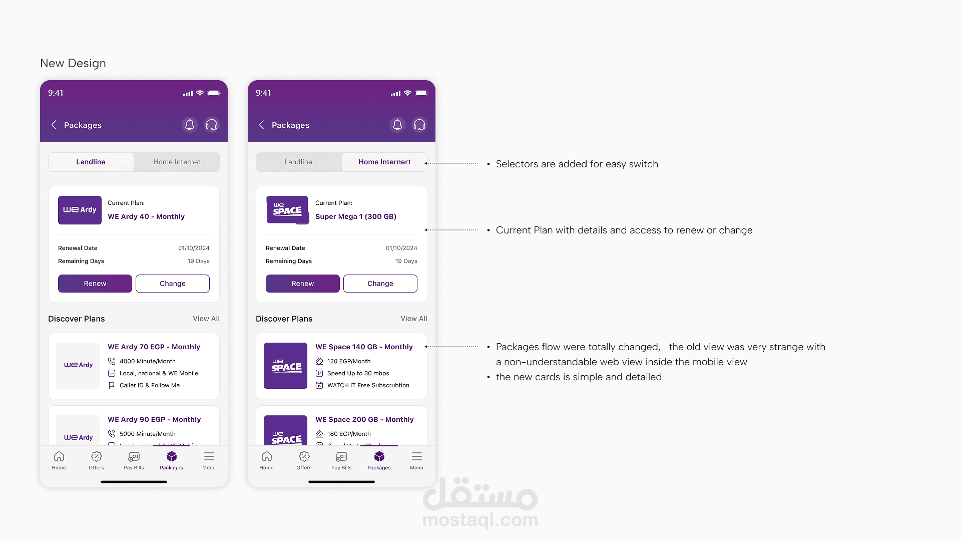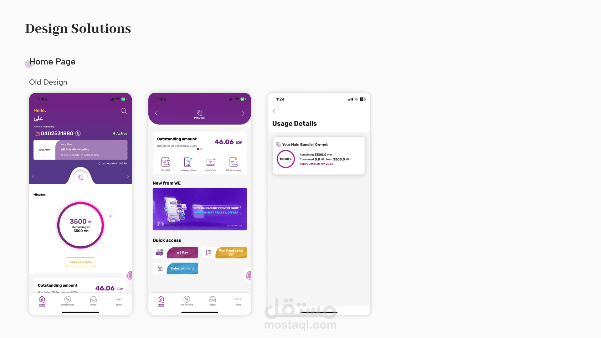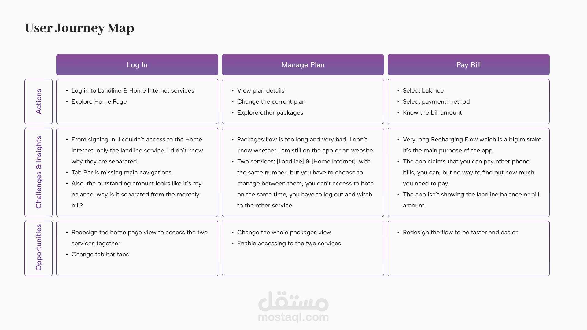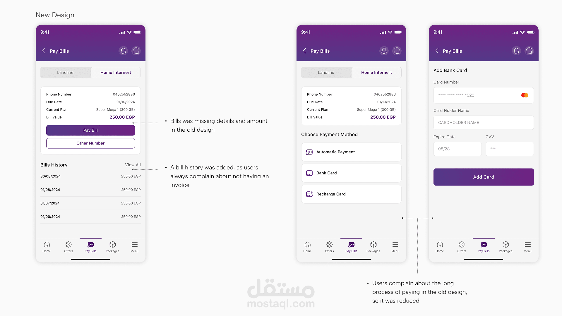 توليت مهمة إعادة تصميم الصفحة الرئيسية، وتدفق الاشتراكات، وعملية دفع الفواتير. لتحقيق ذلك، أجريتُ بحثًا معمقًا عن المستخدمين، وجمعت ملاحظاتهم، وخضت تجربة التطبيق بنفسي. استنادًا إلى هذا التحليل، قمتُ بإنشاء خريطة لرحلة المستخدم لتحديد نقاط التحسين، ثم أعدت تصميم التدفقات المحددة لتعزيز تجربة المستخدم وتبسيط العملية بشكل أكثر كفاءة.