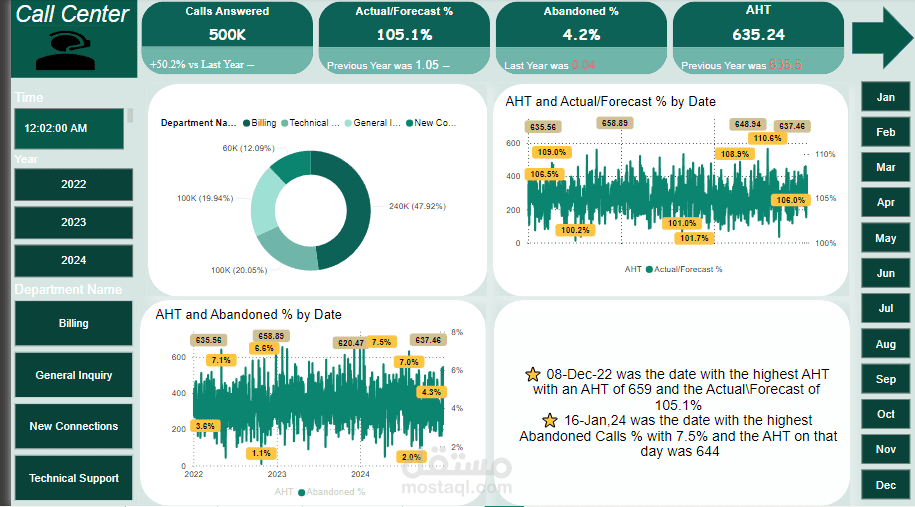 Average Handle Time (AHT): 5.2 minutes, indicating the average time taken to manage a call.