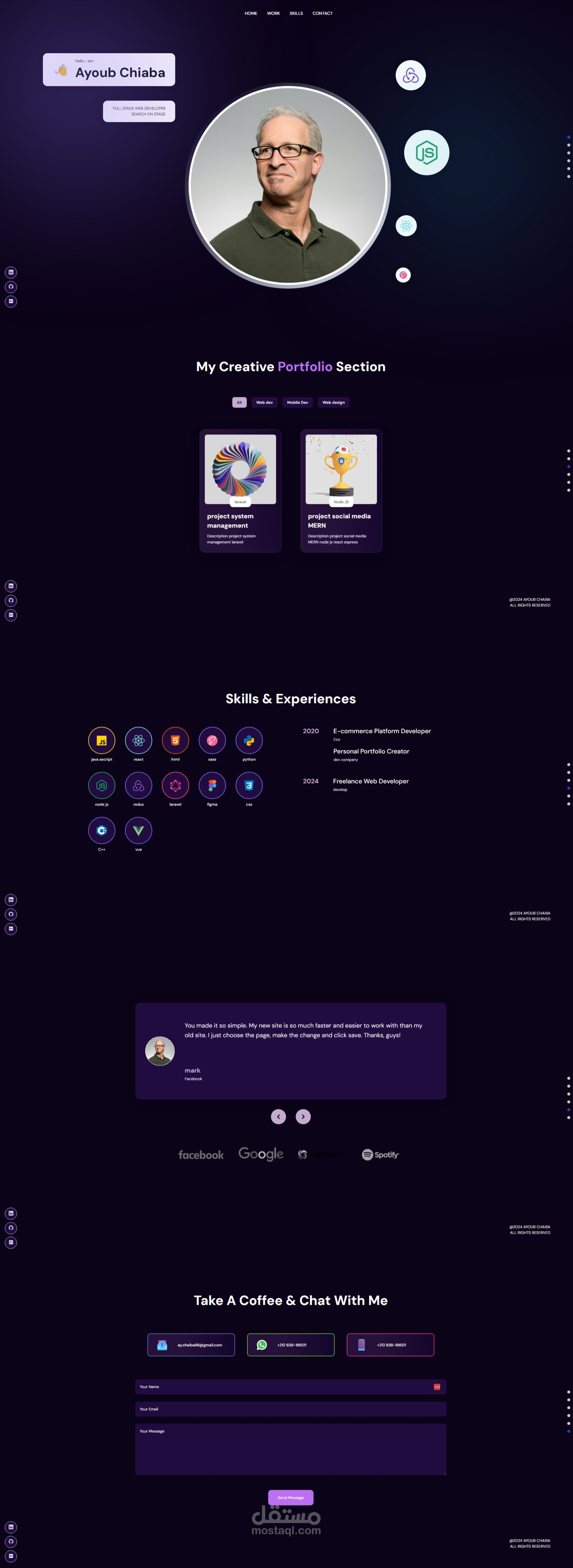 موقع شخصي لعرض المشاريع والخبرات، يتميز بتصميم جذاب ومتجاوب مع جميع الشاشات. تم تطوير الموقع باستخدام أحدث تقنيات الويب لضمان أداء ممتاز وتجربة مستخدم مريحة وسلسة. التقنيات المستخدمة تشمل: