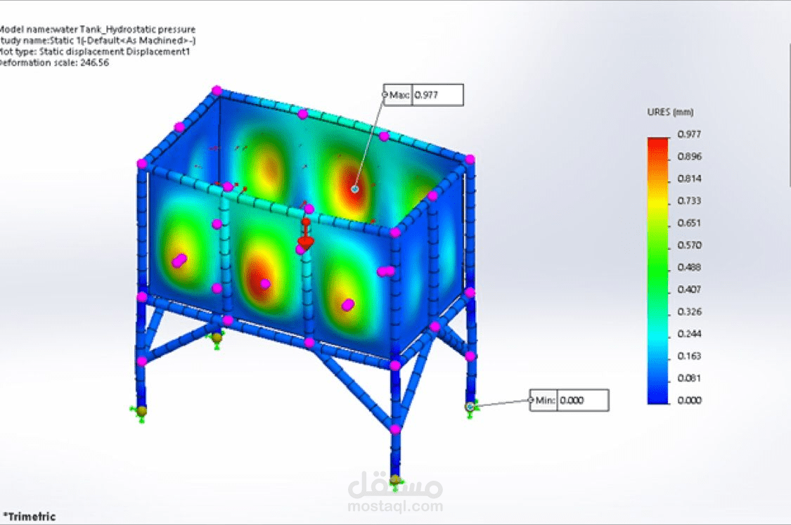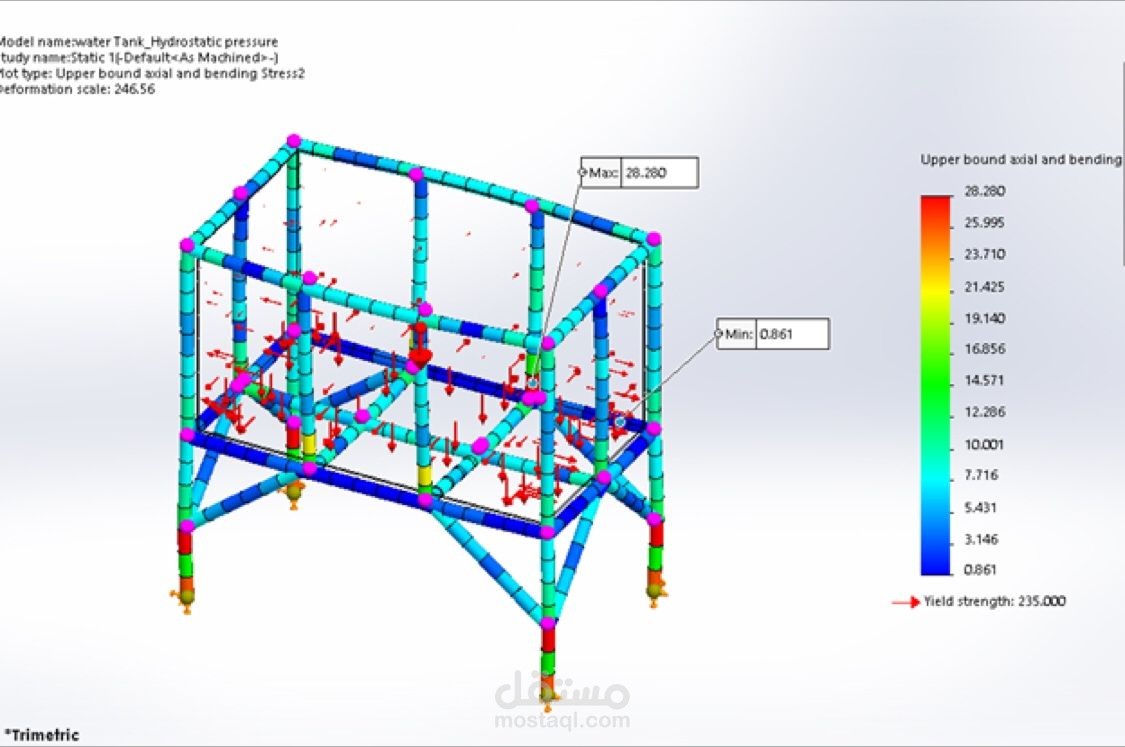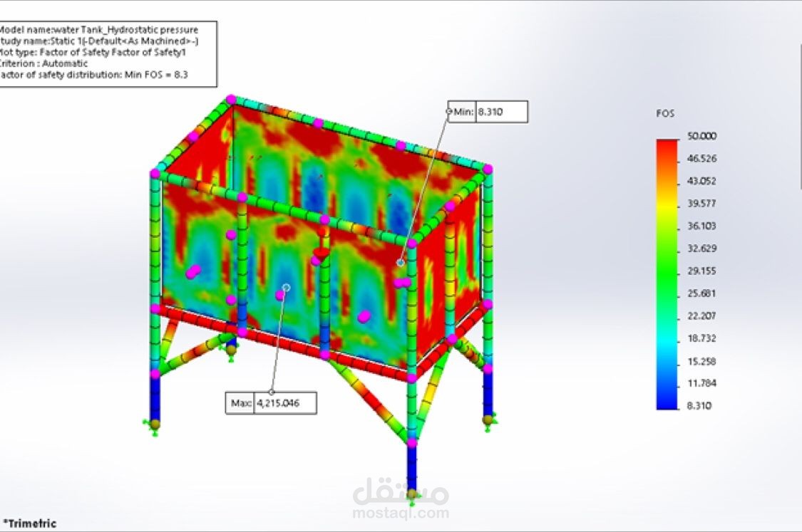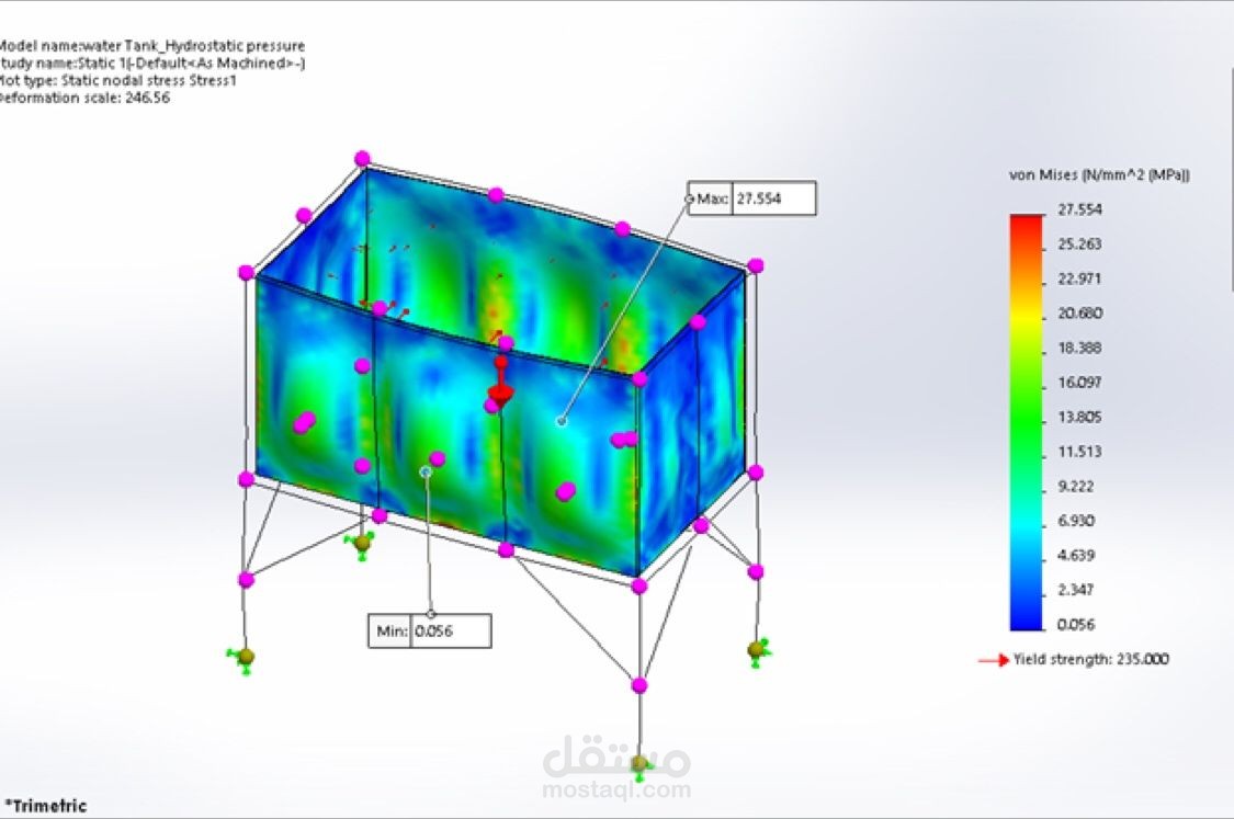 For the water tank, I applied non-uniform hydrostatic pressure and calculated maximum stress, displacement, and safety factors. This provided valuable insights into the tank’s structural integrity.