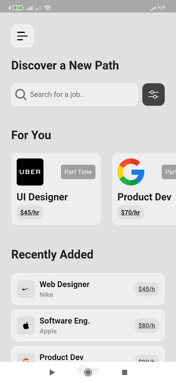 تطبيق Job App هو منصة لعرض وظائف مختلفة للمستخدمين. يتيح البحث عن فرص عمل بسهولة، ويعرض وظائف مقترحة بناءً على اهتمامات المستخدم، بالإضافة إلى أحدث الوظائف المتاحة مع تفاصيل مثل الأجر بالساعة ونوع الوظيفة.