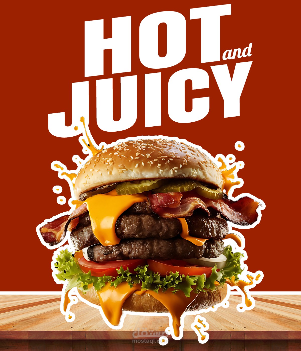 This image is interesting and relevant for a graphic designer because it showcases the use of vibrant colors, textures, and typography to create an eye-catching and appetizing advertisement. The combination of visual elements effectively conveys the message of a delicious, hot, and juicy burger.