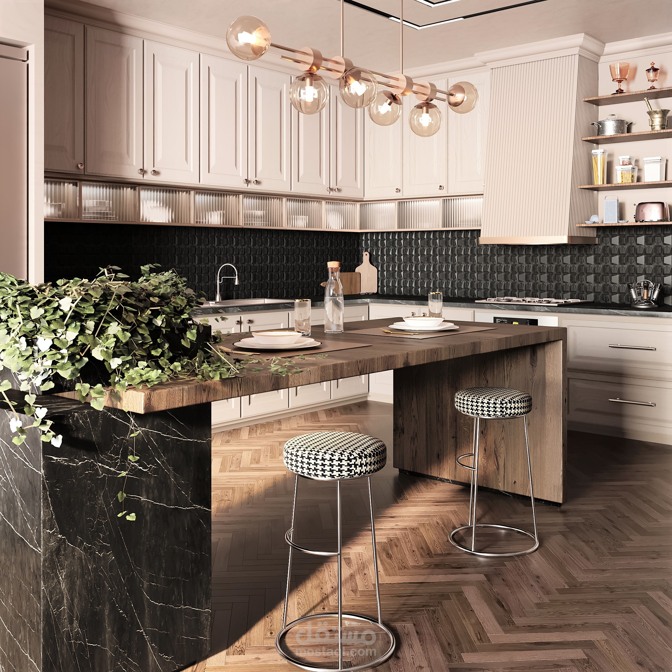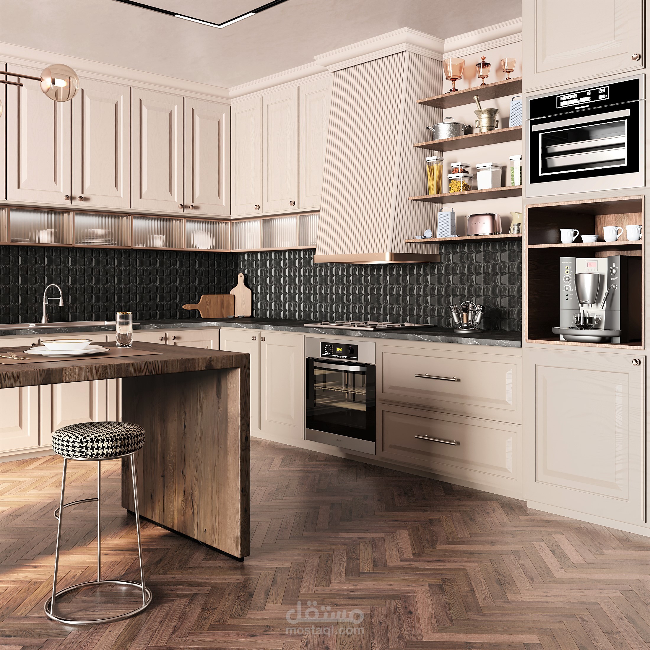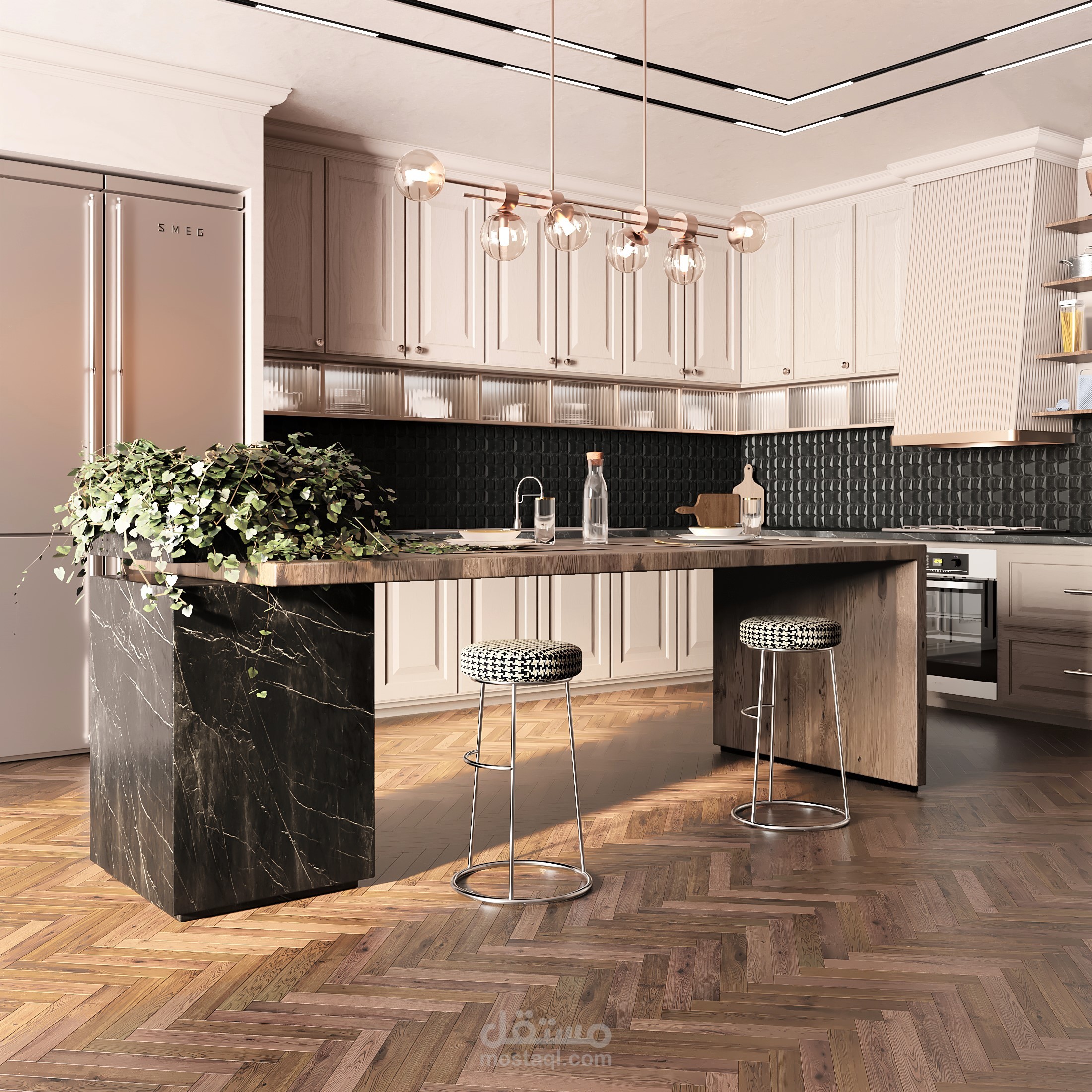 يهدف هذا المشروع إلى تصميم مطبخ يجمع بين الأسلوب الكلاسيكي والحديث، مع تحقيق توازن مثالي بين الأناقة والراحة. لتنفيذ رؤية العميل, قمت باختيار الألوان المحايدة والخطوط العصرية، مع استخدام البلاط الأسود المزخرف والأرضيات الخشبية لتوفير لمسة من الفخامة. تمت إضافة الرخام إلى الجزيرة، مع مقابض عصرية وأبواب زجاجية، بجانب إضاءة مدروسة لتكملة التصميم. خزائن باللون البيج وزخارف تاج بسيطة أضفت لمسة من الأناقة. تمركزت الجزيرة في وسط المطبخ، متكاملة مع الخشب والنباتات الخضراء لخلق ركن هادئ. كما ان الثريا الفاخرة أضافت للمطبخ لمسة من الترف والجمال.