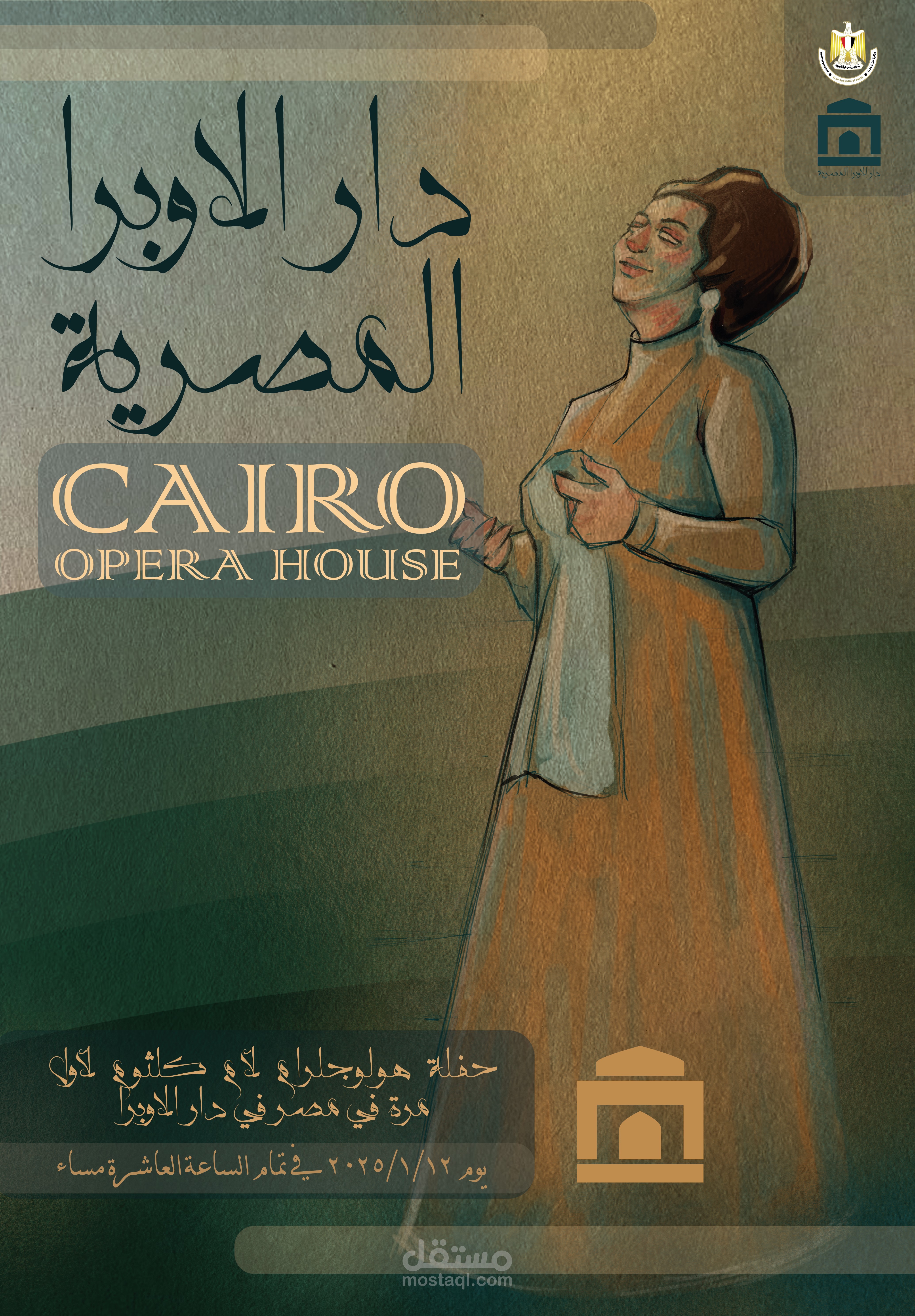 بوستر وهمي مقام بدار الأوبرا لحفلة وهمية لأم كلثوم حفلة هولوجرام استخدمت الفوتوشوب وبعض تأثيرات ورسمت شخصية لأم كلثوم بأسلوبي واستخدمت الاليستريتور للكتابة