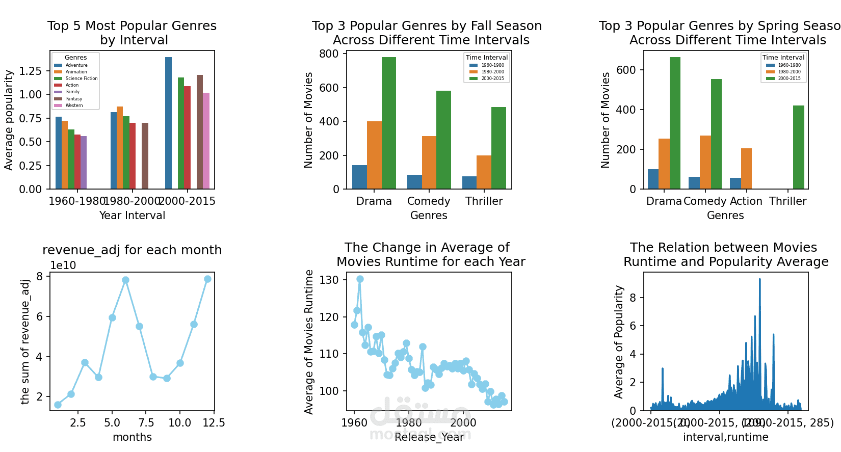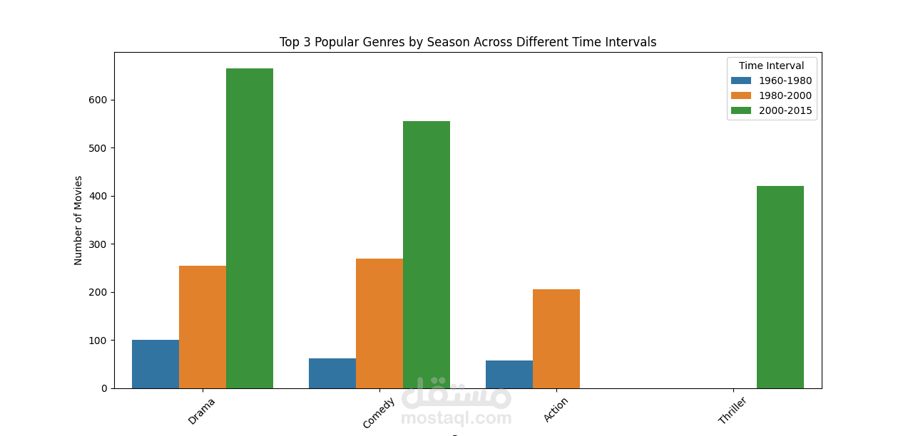 تحولات في الأنواع الأكثر شعبية: كانت الدراما والأكشن الأكثر شعبية بين 1960-1980، في حين اكتسبت الكوميديا شهرة بين 1980-2000، وأصبحت أفلام الخيال العلمي والمغامرة أكثر انتشارًا بين 2000-2015.