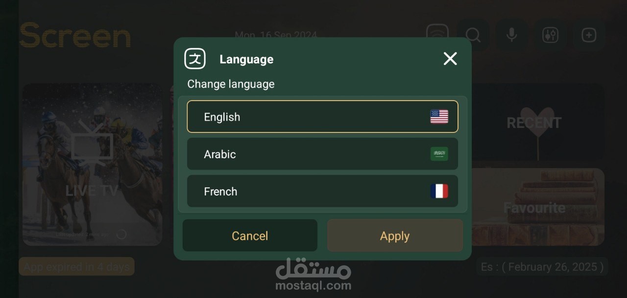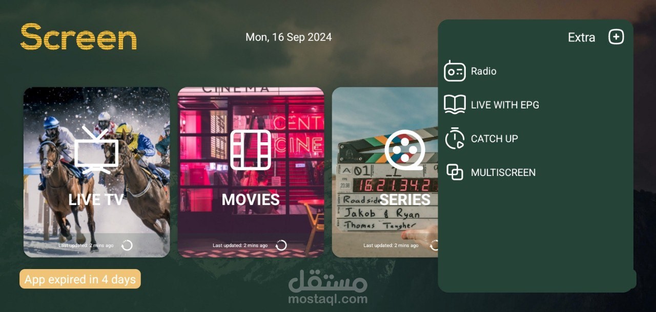 تطبيق Screen هو مشغل بث فيديو رائع يتيح لعملاء OTT أو المستخدمين النهائيين بث المحتوى مثل القنوات التلفزيونية المباشرة، الفيديو عند الطلب (VOD)، المسلسلات، وإعادة تشغيل البرامج التلفزيونية التي توفرها لهم؛ على أجهزتهم التي تعمل بنظام Android + ios