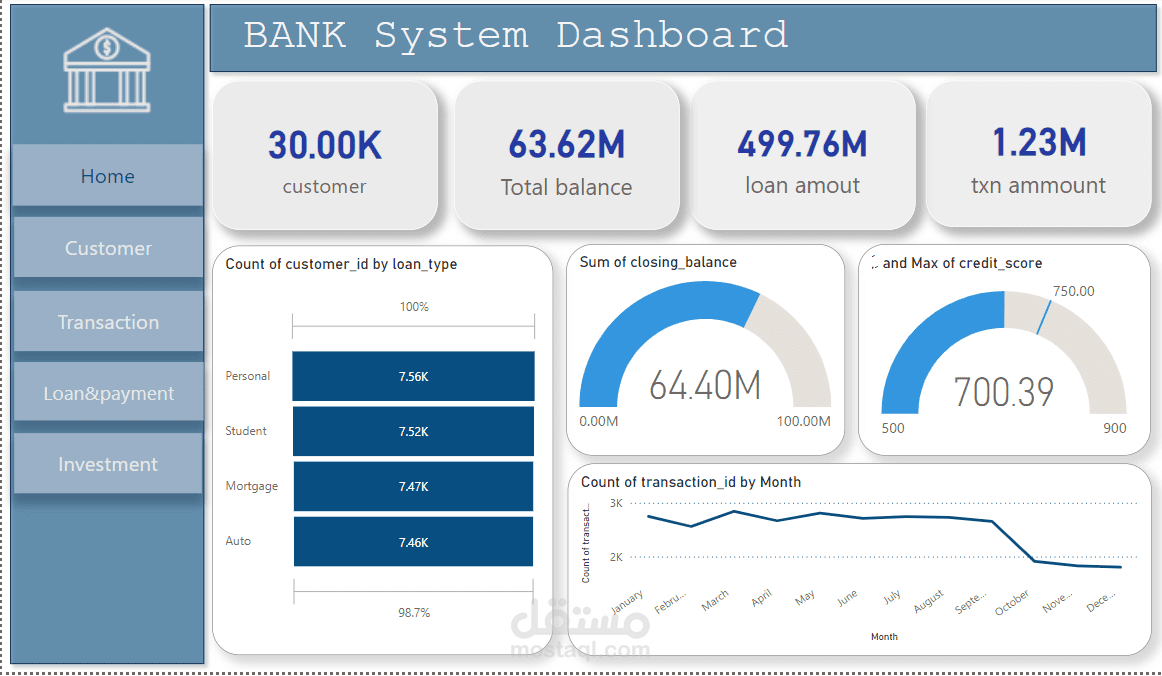 يهدف المشروع إلى تطوير لوحة تحكم تفاعلية ومتقدمة لنظام بنك، بحيث تساعد المديرين وأصحاب القرار في البنك على مراقبة الأداء المالي، تحليل بيانات العملاء والمعاملات، وتقييم أداء الفروع بشكل فوري وسهل. ستعتمد لوحة التحكم على أحدث تقنيات التحليل والربط مع قاعدة بيانات البنك، مع واجهة مستخدم بسيطة لكنها غنية بالمعلومات، مما يسهم في اتخاذ قرارات مدروسة وسريعة.