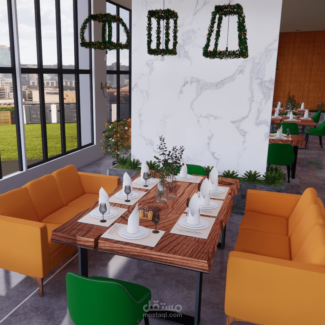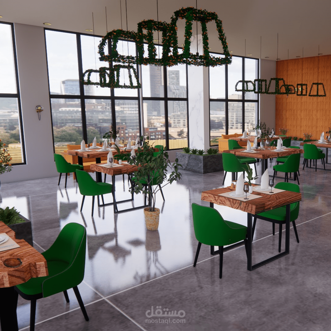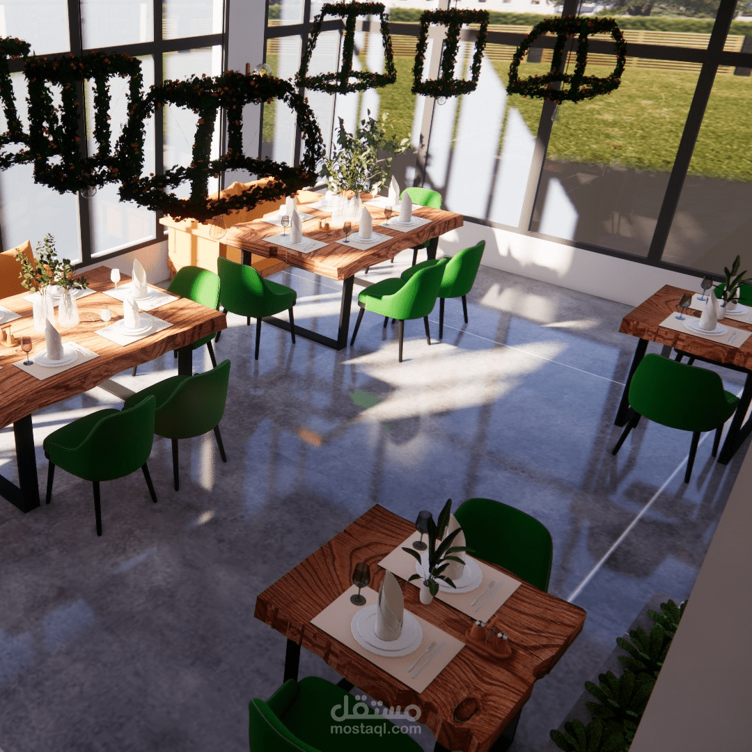 قمت بهذا التصميم وفقا لطلب العميل على عمل مطعم يجمع الطبيعة معه ويعطي شعور براحة والاشراق ودمج خشب وعمل على حوائط من زجاج و دمج نباتات