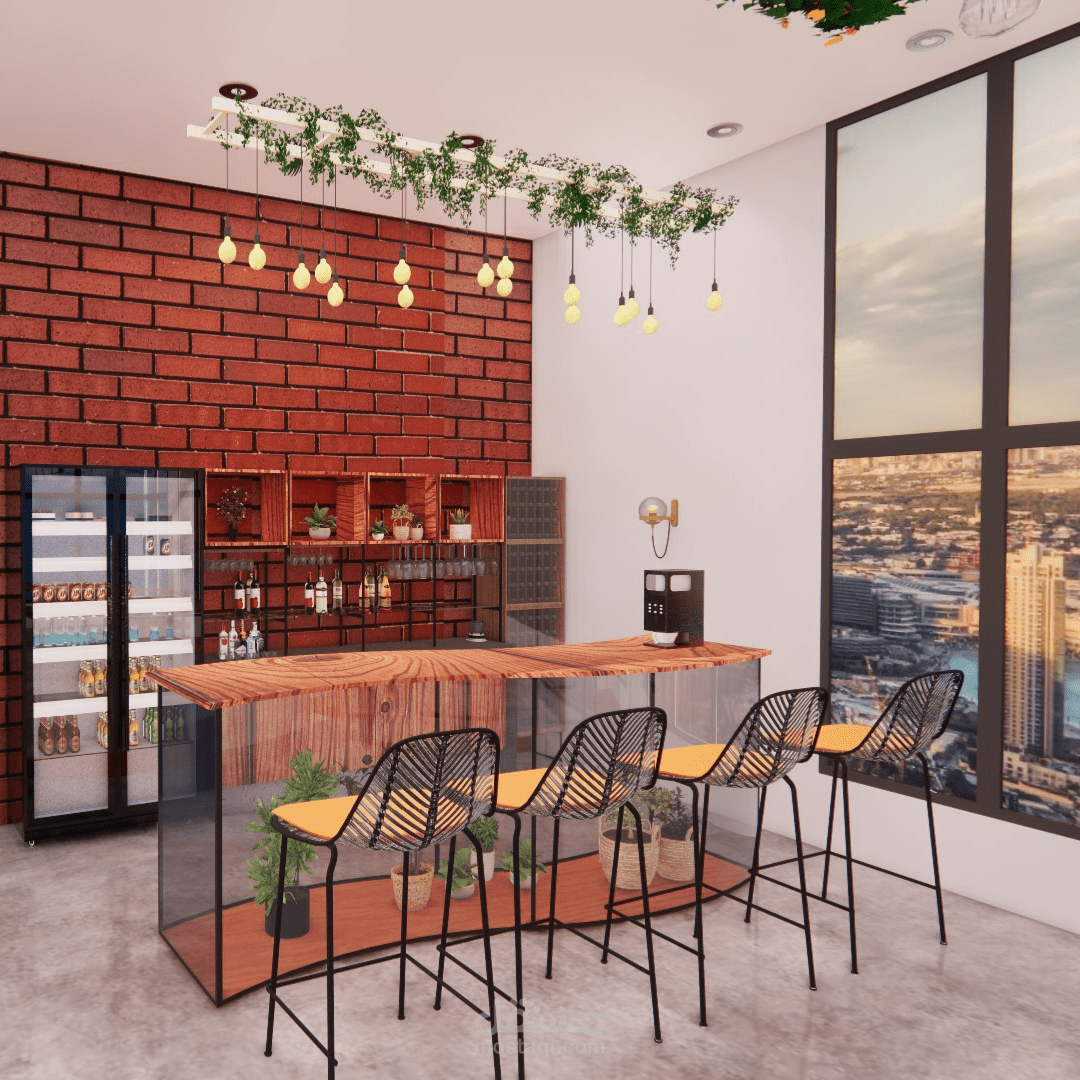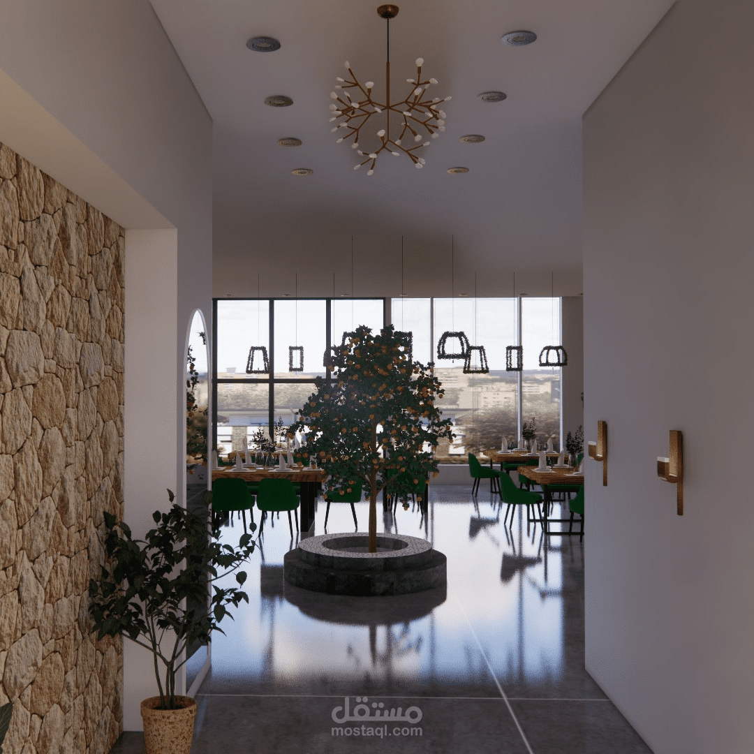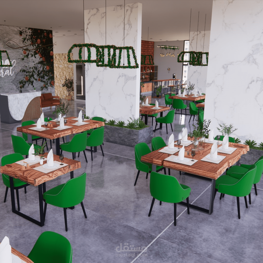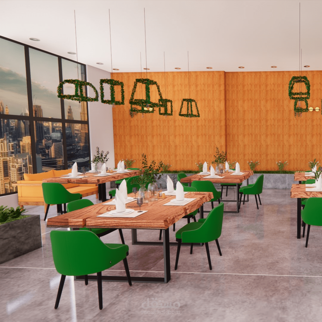 قمت بهذا التصميم وفقا لطلب العميل على عمل مطعم يجمع الطبيعة معه ويعطي شعور براحة والاشراق ودمج خشب وعمل على حوائط من زجاج و دمج نباتات