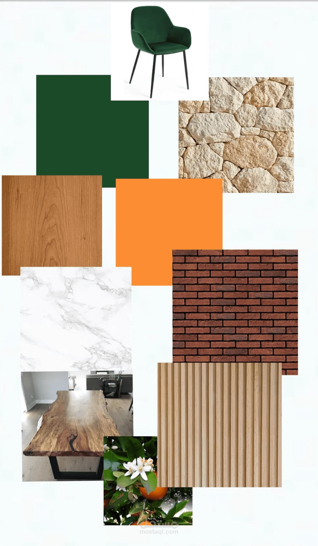 تم استخدام خامات : خشب طبيعي , بلاط برسولان , بلاط كراميكا , والحجر الاحمر , زجاج , حجر قدسي , جبس مقاوم للعوامل