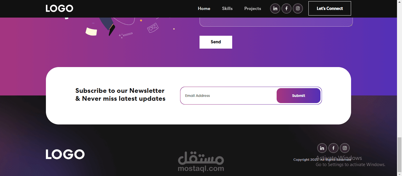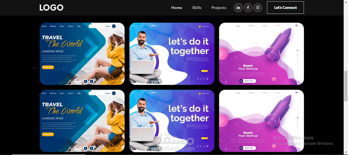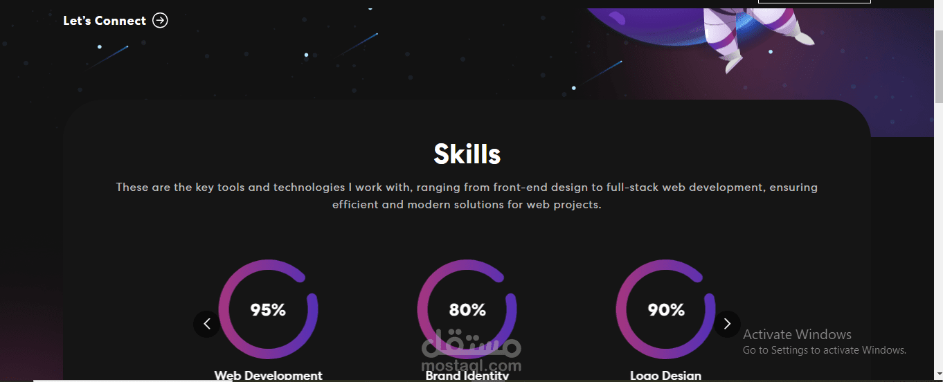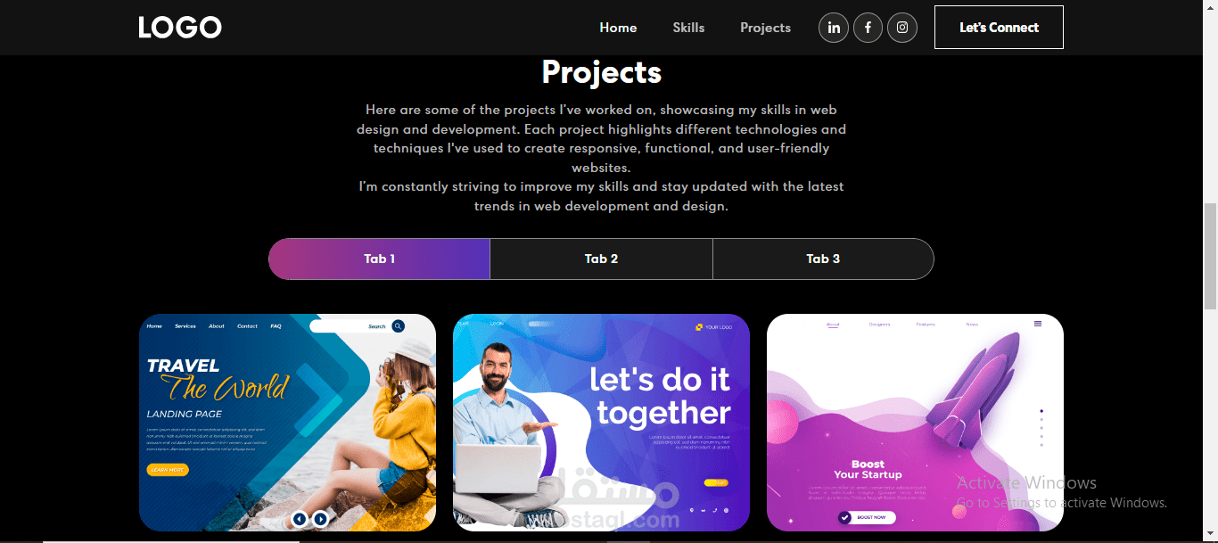 موقع شخصي يعرض المهارات، المشاريع السابقة، والسيرة الذاتية بطريقة احترافية. يشمل قسمًا للمعلومات الشخصية، معرض أعمال، ورابط للتواصل المباشر.