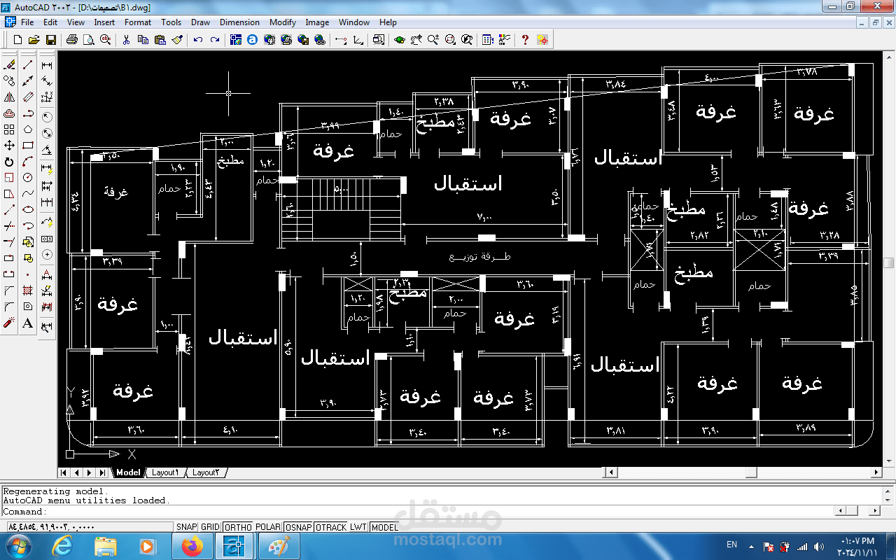 التصميم المعماري عمارة سكنية خمس شقق سبعة ادوار مصمم علي الاوتوكاد مقسمة المساحة تقسيم جيد بالاضافة الي احترام الخصوصية في غرف النوم اضافة الي عدد 2 حمام واستقبال للضيوف 2d