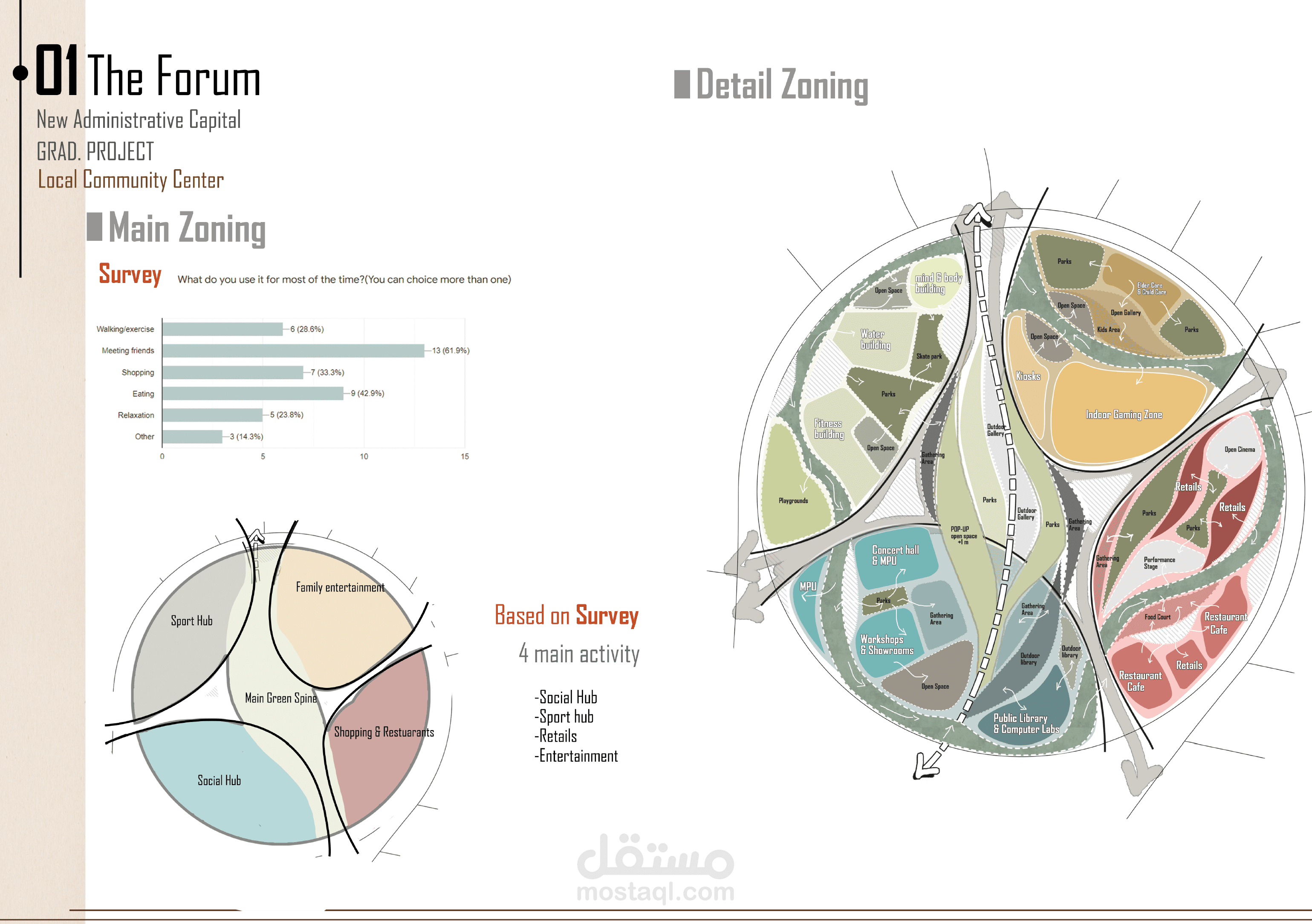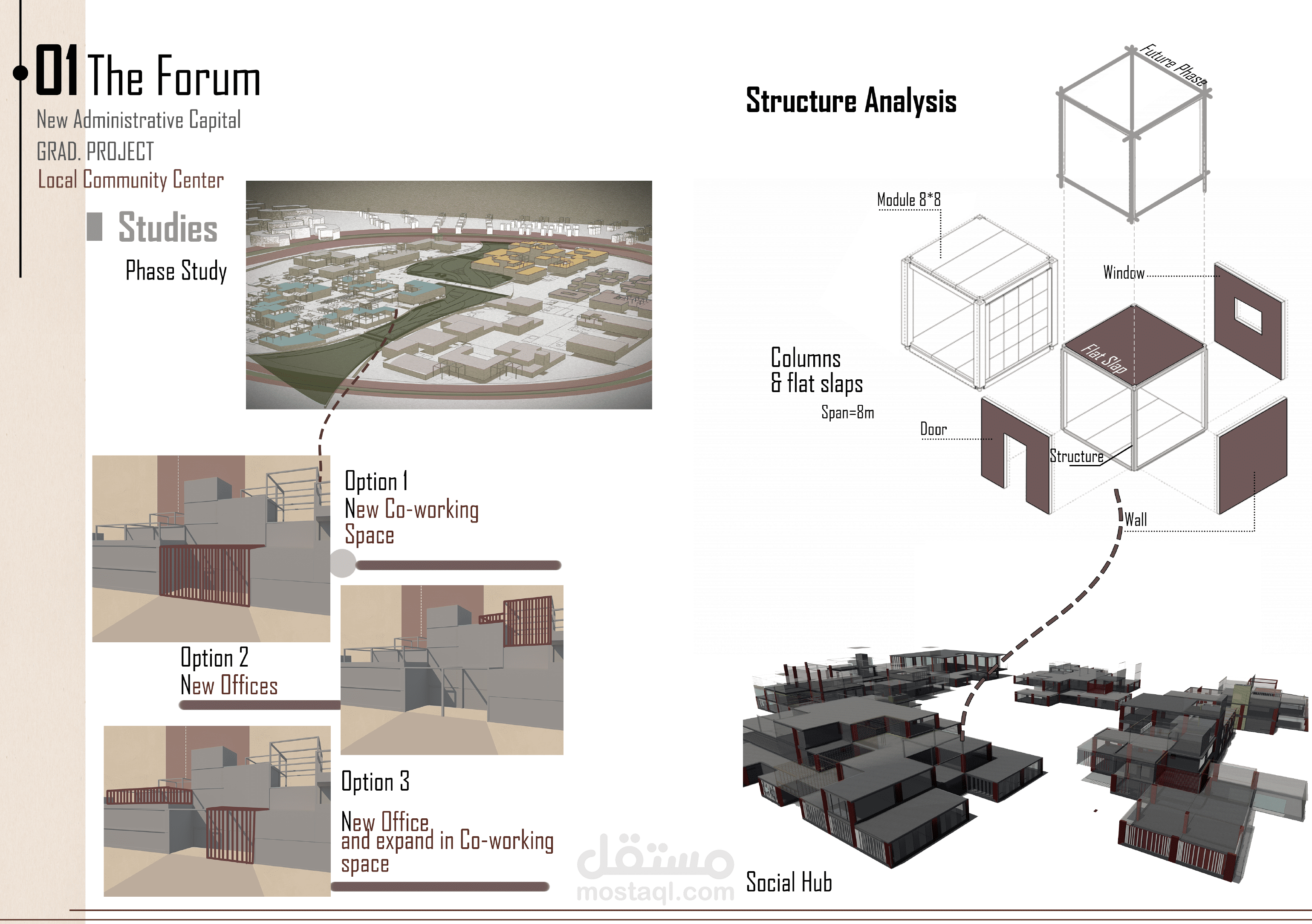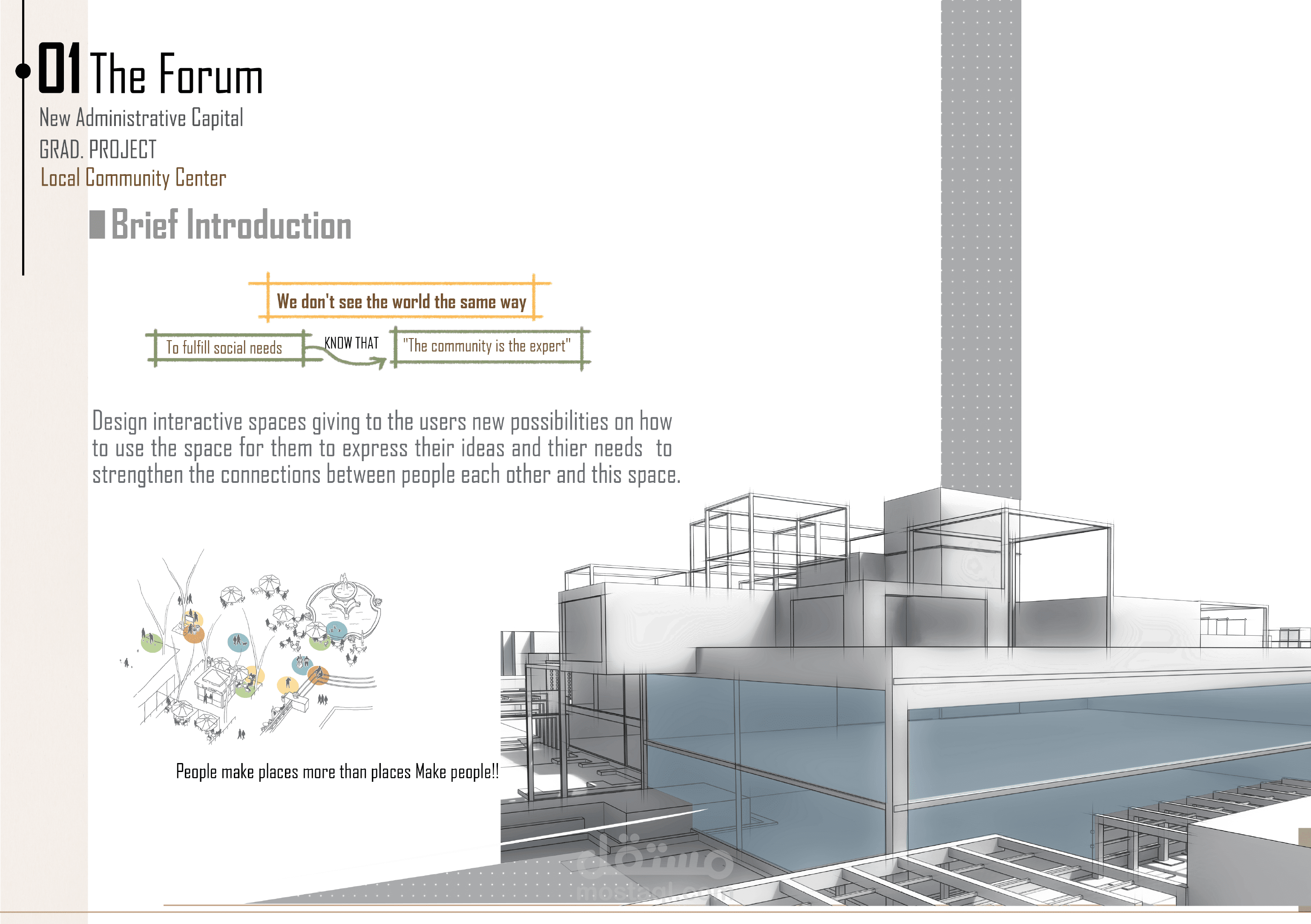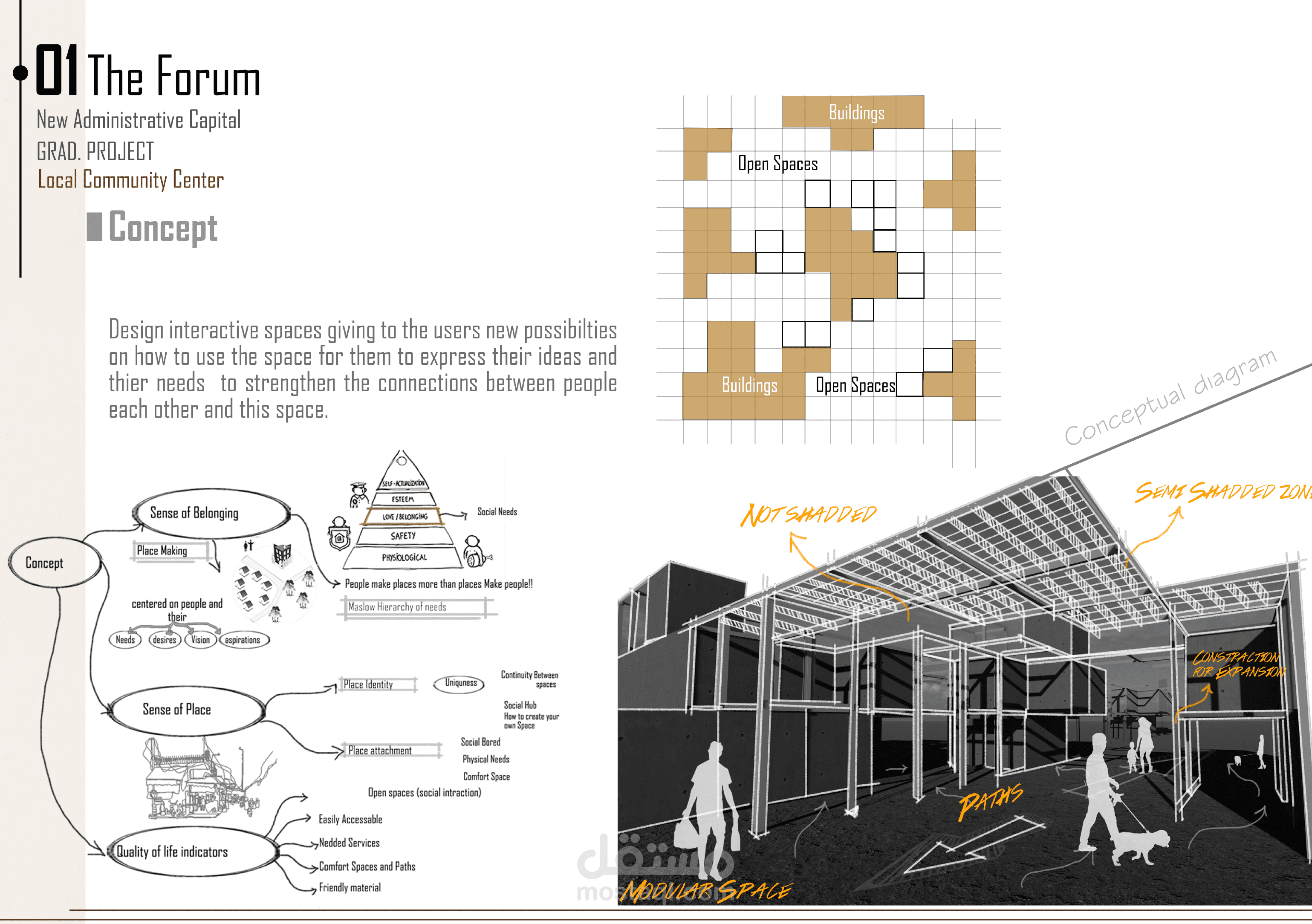 - تطوير فكرة تصميمية تستند إلى تحسين جودة الحياة الحضرية من خلال إنشاء مساحات مرنة ومتعددة الاستخدامات.