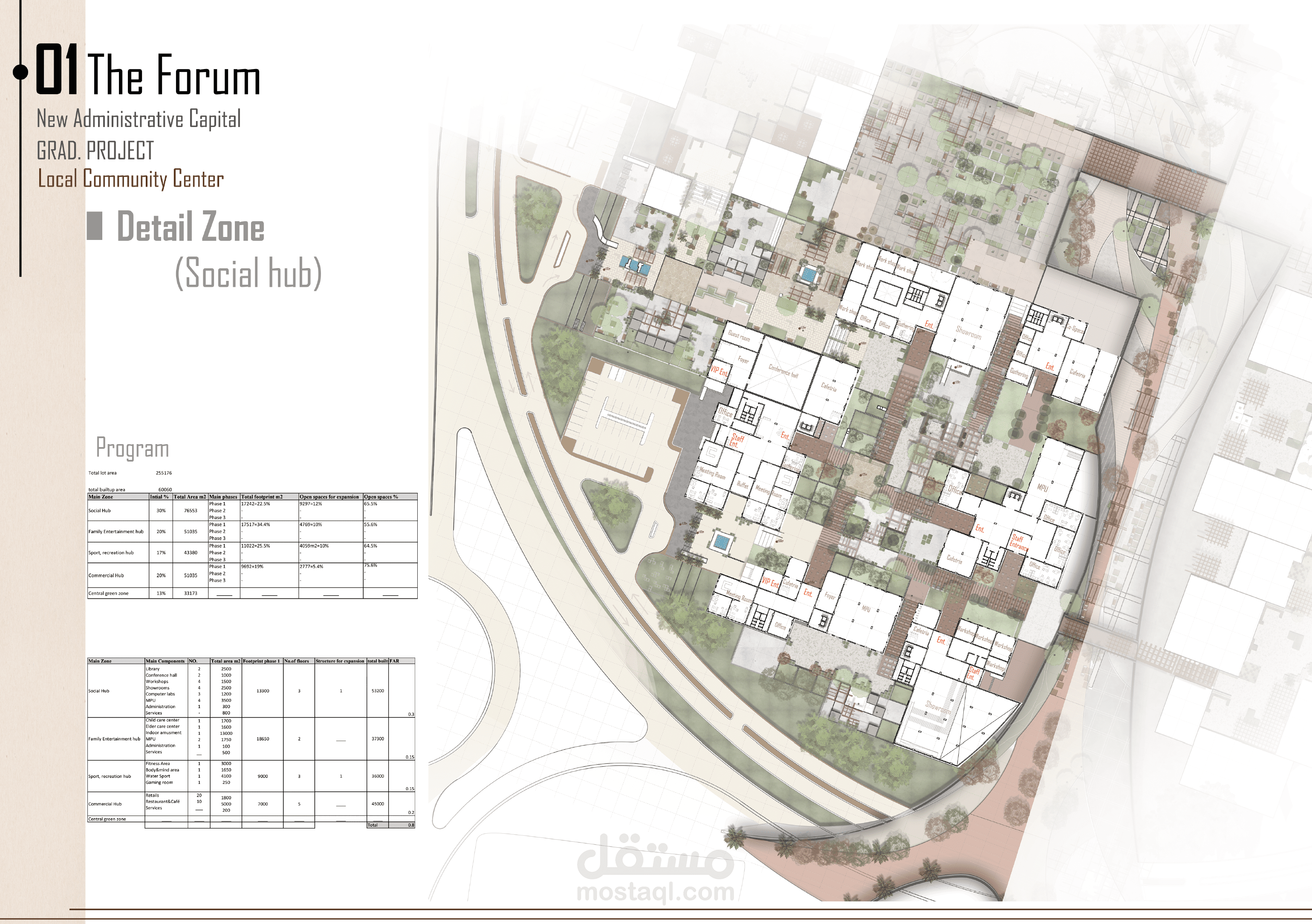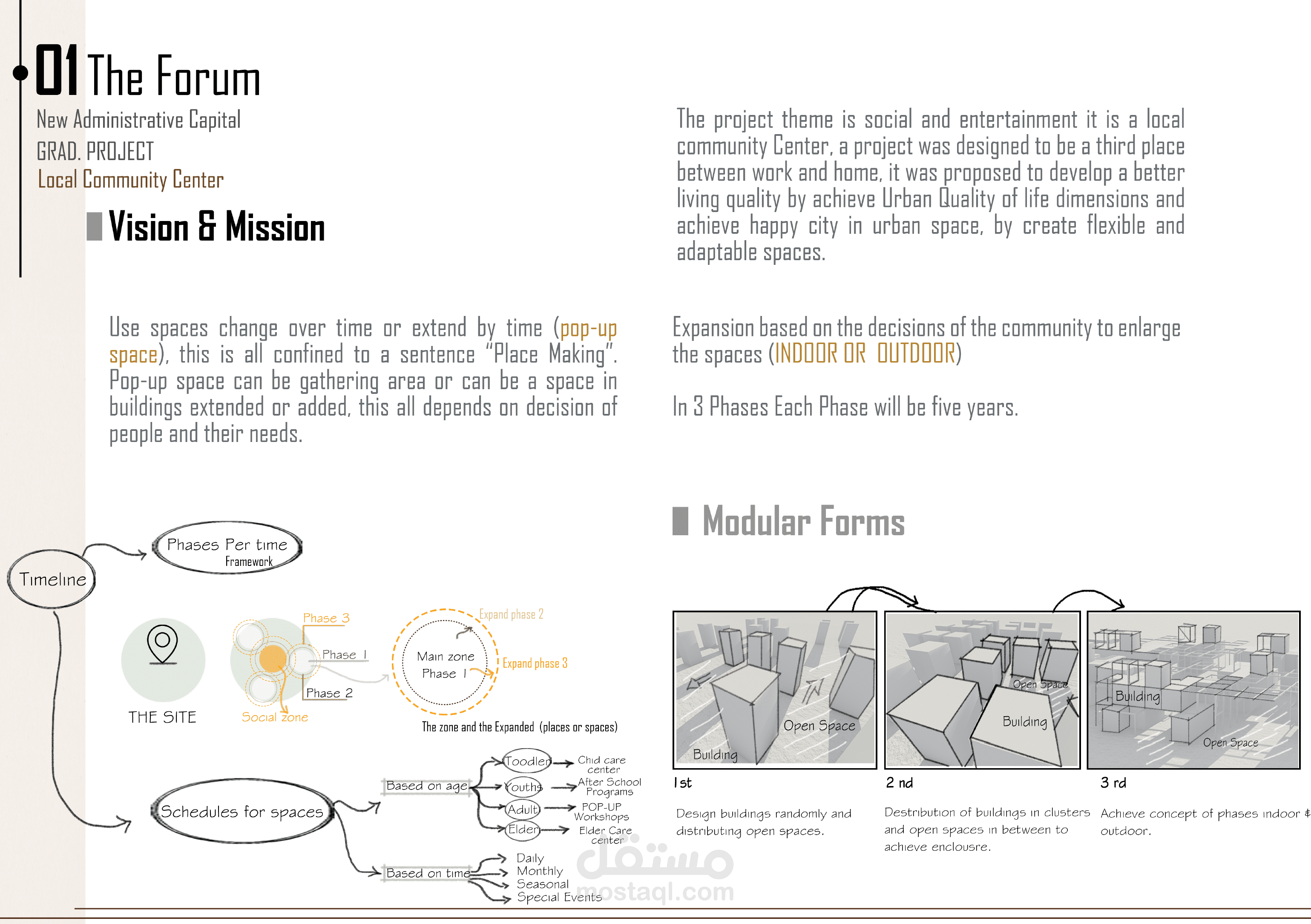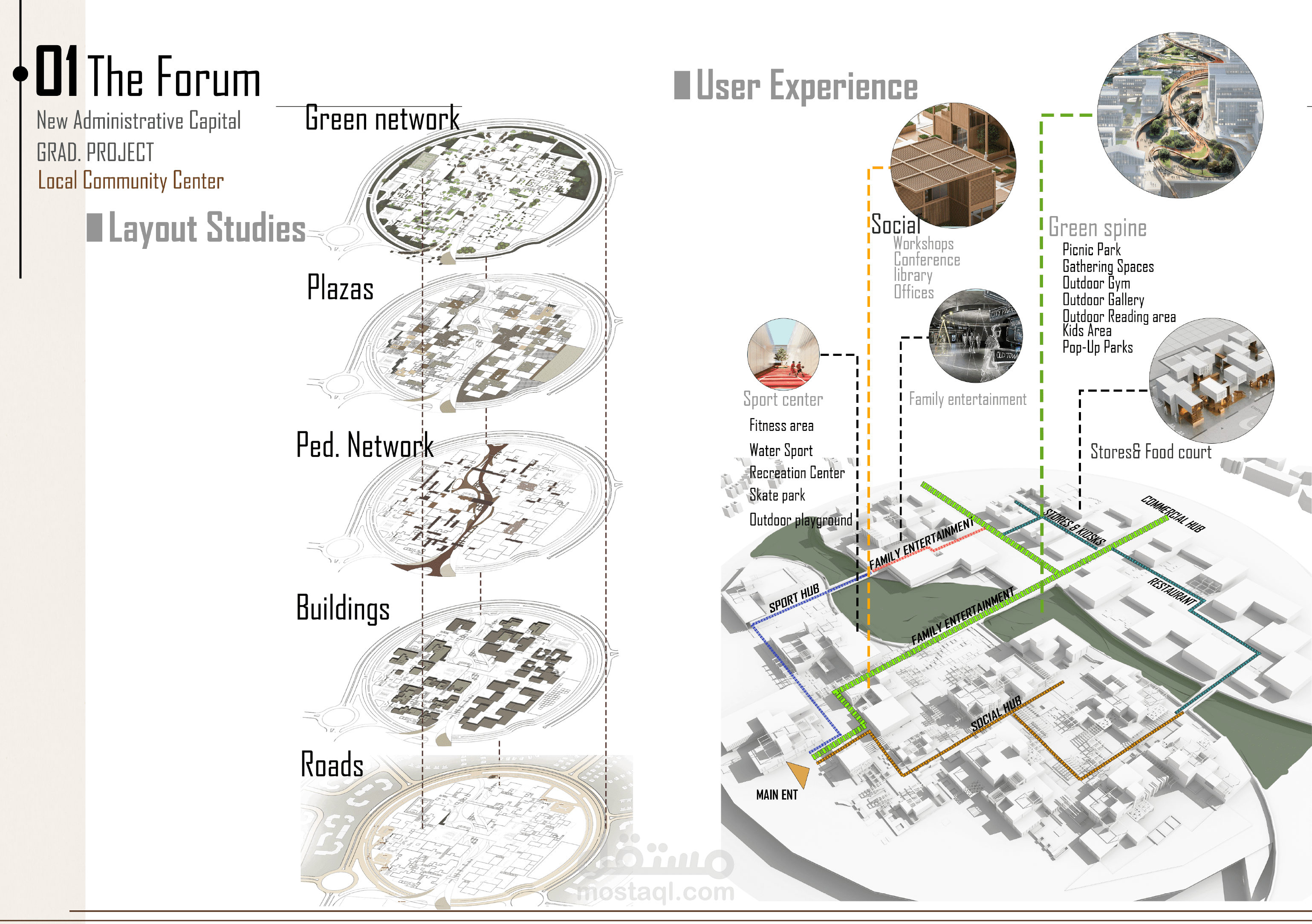 مشروع "المركز المجتمعي الاجتماعي والترفيهي" هو تصميم مبتكر يهدف إلى تحسين جودة الحياة الحضرية من خلال تقديم مفهوم "المدينة السعيدة" في الفضاء الحضري. يُعد المشروع بمثابة "المكان الثالث" بين العمل والمنزل، حيث يوفر بيئة مرنة ومتكاملة تعزز التفاعل الاجتماعي، الراحة، والأنشطة الترفيهية.