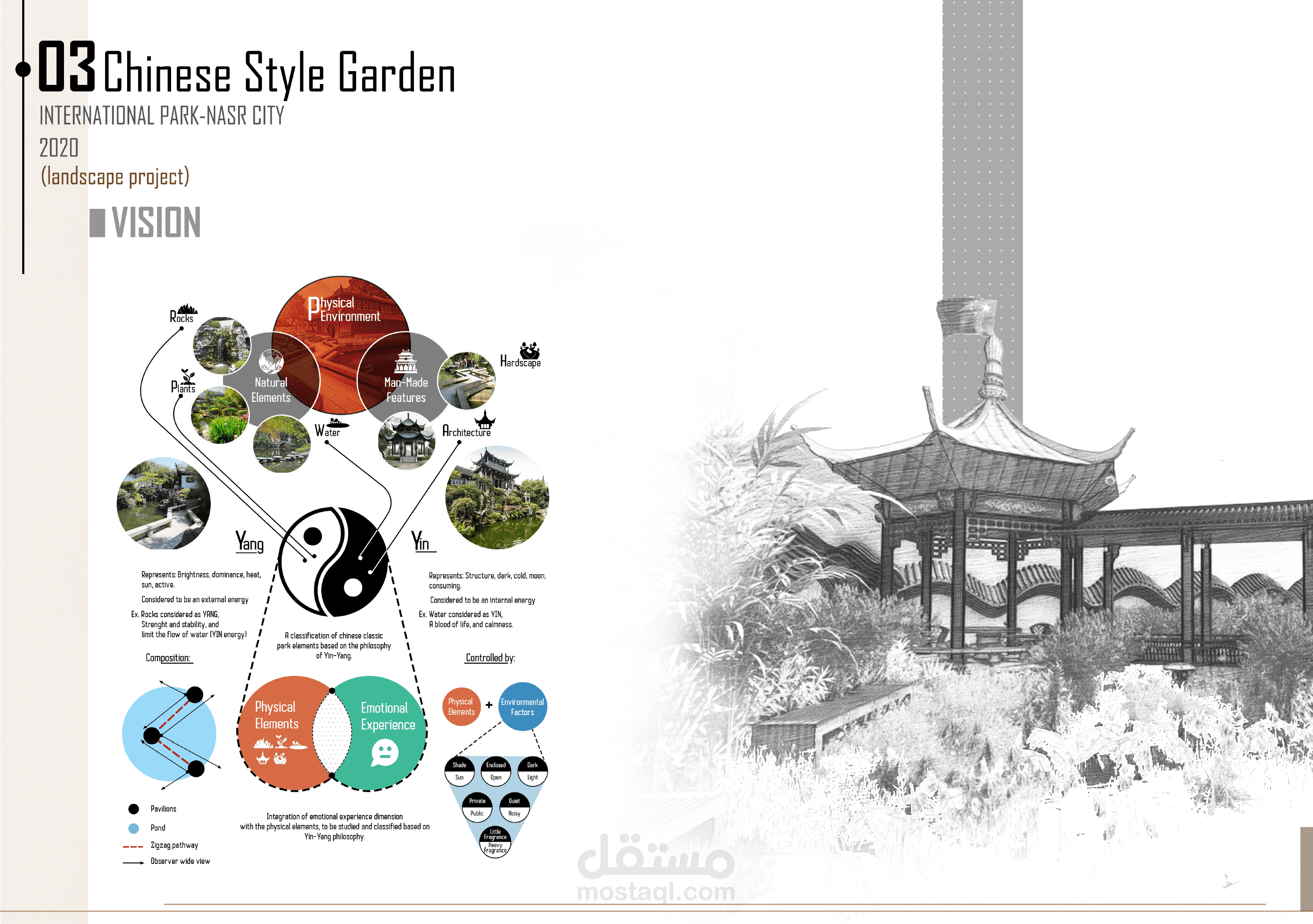 مشروع الحديقة الصينية داخل الحديقة الدولية بمدينة نصر هو تصميم مبتكر يهدف إلى تحقيق التوازن بين التجربة العاطفية والعناصر المادية. يعتمد التصميم على فلسفة الين واليانغ، التي تركز على الانسجام بين العناصر المتناقضة لتحقيق تجربة بصرية ووجدانية متكاملة. يدمج المشروع بين الجمال الطبيعي والتنظيم الهندسي، مما يخلق بيئة مميزة تعكس الطابع الثقافي الصيني في قلب مصر.