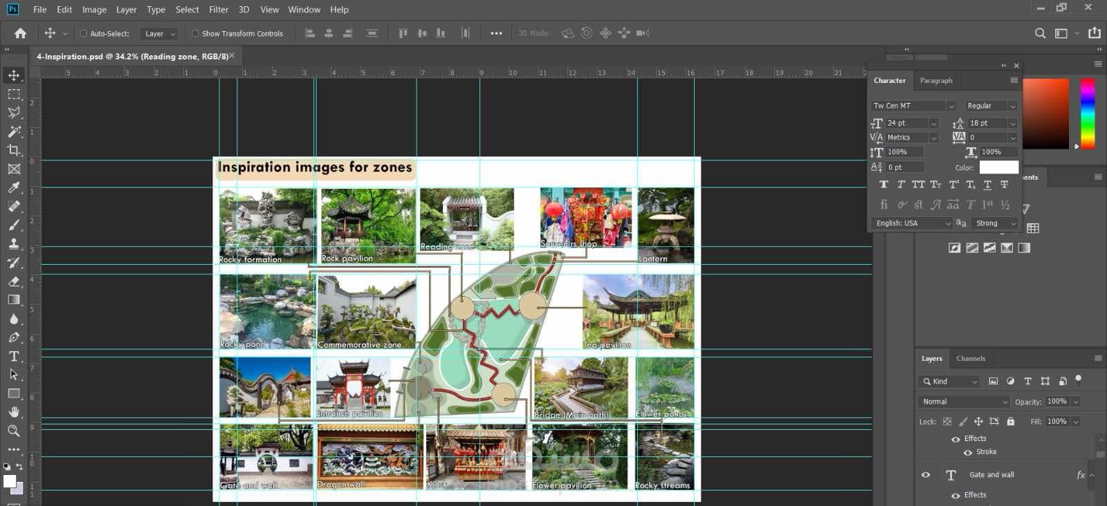 - العمل على توزيع العناصر المادية مثل الجسور الصغيرة، البرك، والمجسمات التقليدية لضمان تحقيق الانسجام البصري.