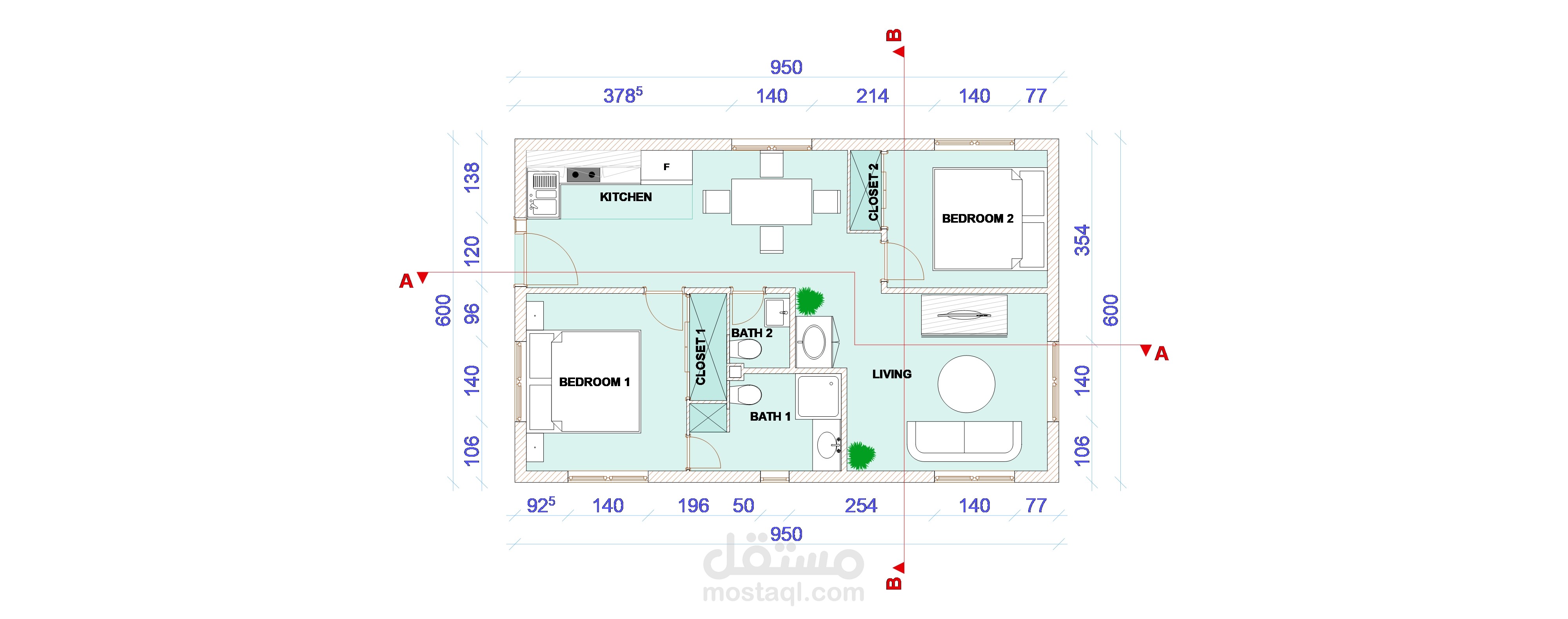 غرفة المعيشة: مساحة 3.5 م × 3 م، مما يوفر مساحة واسعة للأثاث المريح.