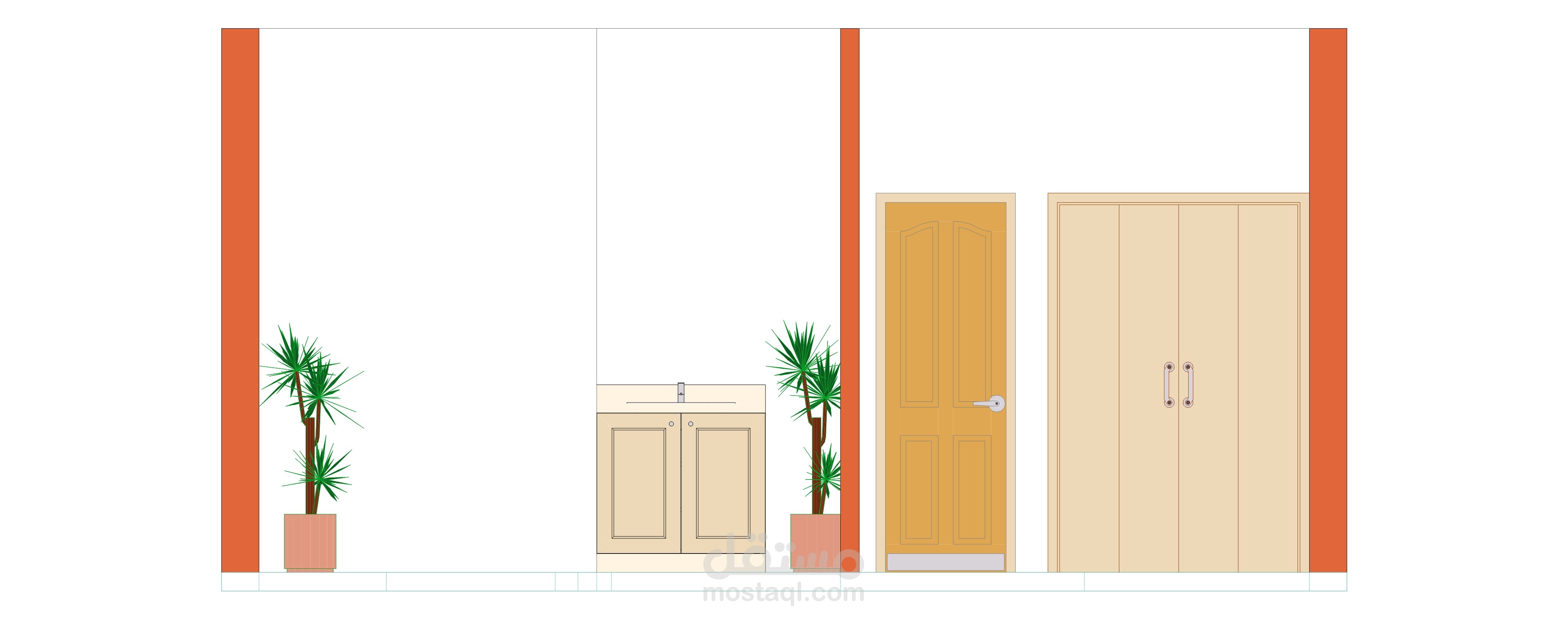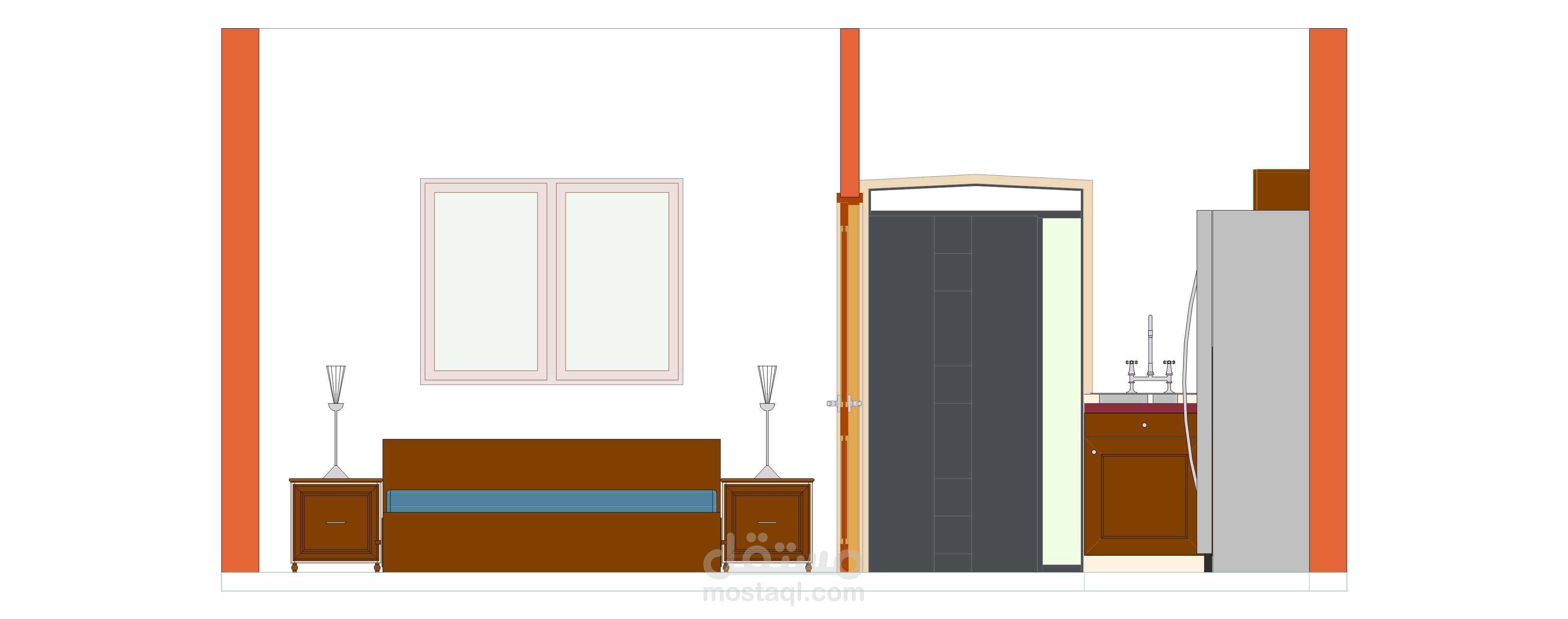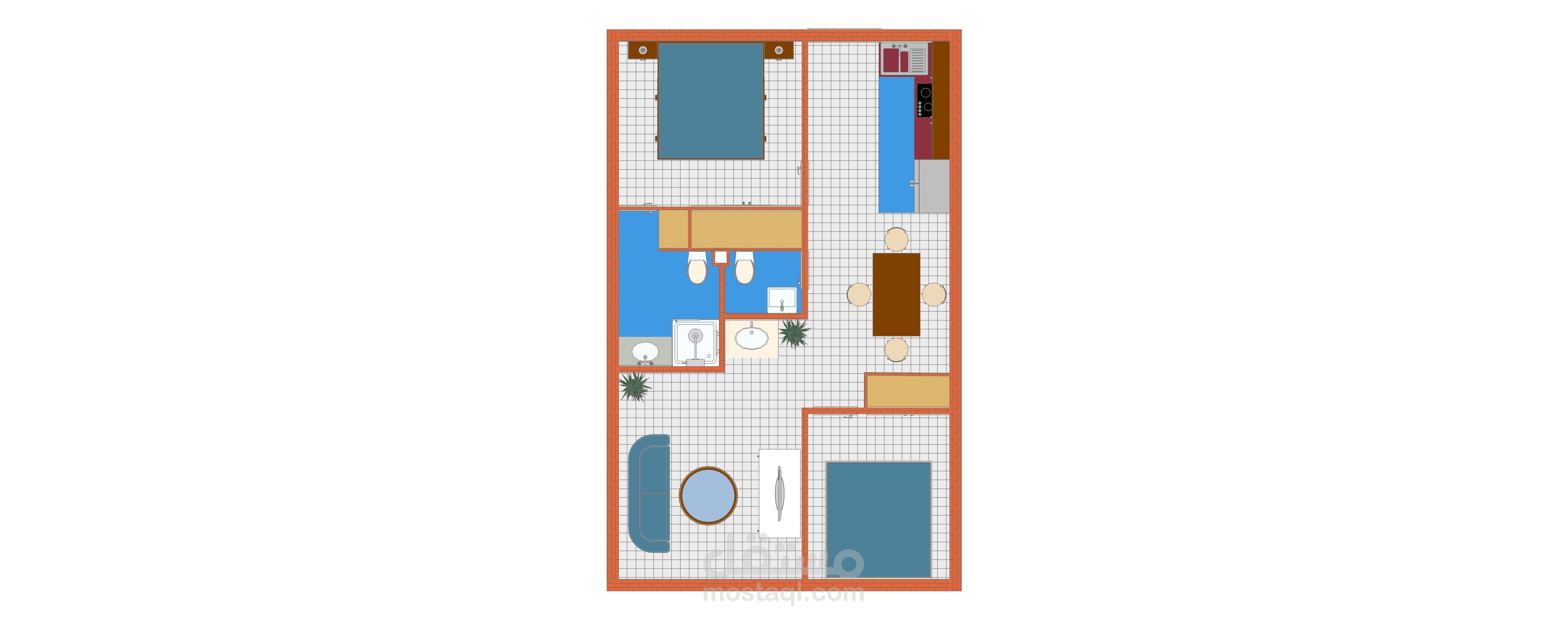 غرفة النوم 1: بأبعاد 3 م × 3 م، مع خزانة مدمجة بمقاس 1.85 م × 0.6 م وحمام ملحق بمقاس 1.7 م × 2 م.