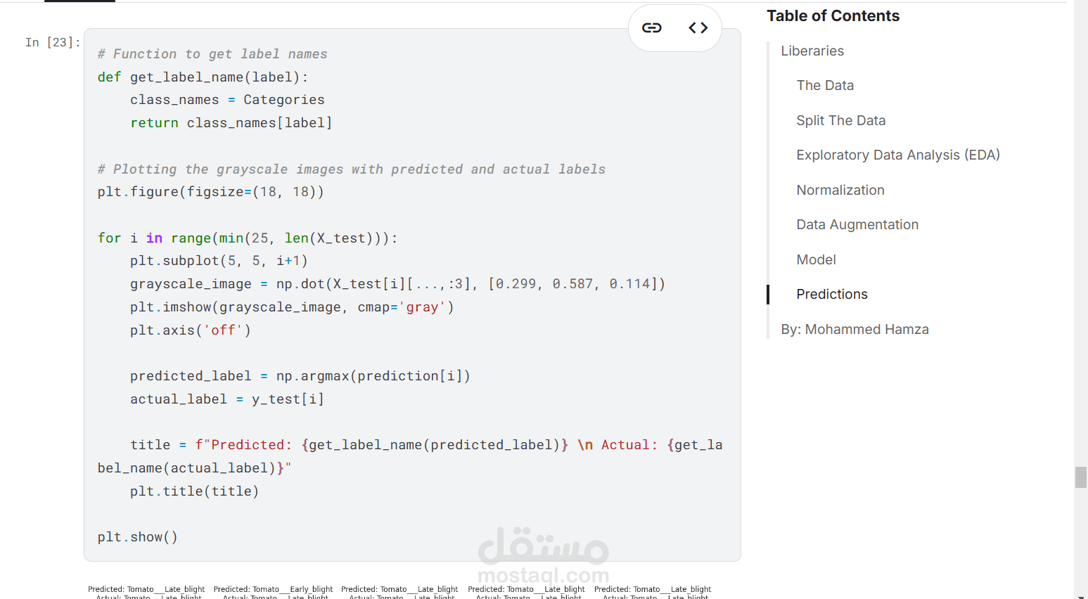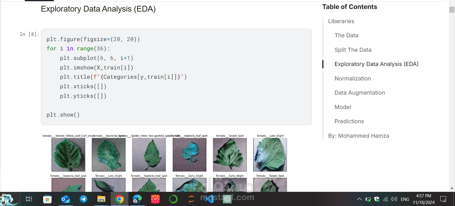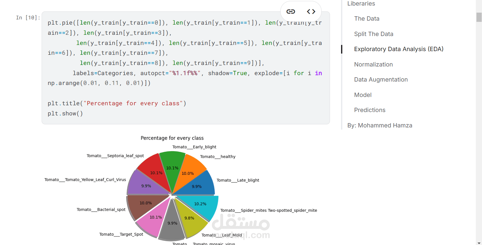 يُعد هذا المشروع تطبيقاً متقدماً في مجال الذكاء الاصطناعي والتعلم العميق، حيث يهدف إلى تطوير نظام ذكي قادر على تشخيص أمراض نبات الطماطم من خلال تحليل صور الأوراق باستخدام الشبكات العصبية التلافيفية (CNN). يبدأ المشروع بمعالجة مجموعة كبيرة من صور أوراق الطماطم وتجهيزها، ثم يقوم بتحليل البيانات وعرض توزيع الفئات المختلفة للأمراض، ليتم بعد ذلك بناء وتدريب نموذج عميق يتكون من خمس طبقات تلافيفية مع تقنيات متقدمة لتحسين الأداء مثل Data Augmentation وDropout، وأخيراً يتم تقييم النموذج من خلال مجموعة من المقاييس والرسوم البيانية التي تظهر دقة تصنيفه للأمراض المختلفة، مما يجعل هذا النظام أداة قيّمة للمزارعين وخبراء الزراعة في الكشف المبكر عن أمراض الطماطم واتخاذ الإجراءات العلاجية المناسبة في الوقت المناسب.