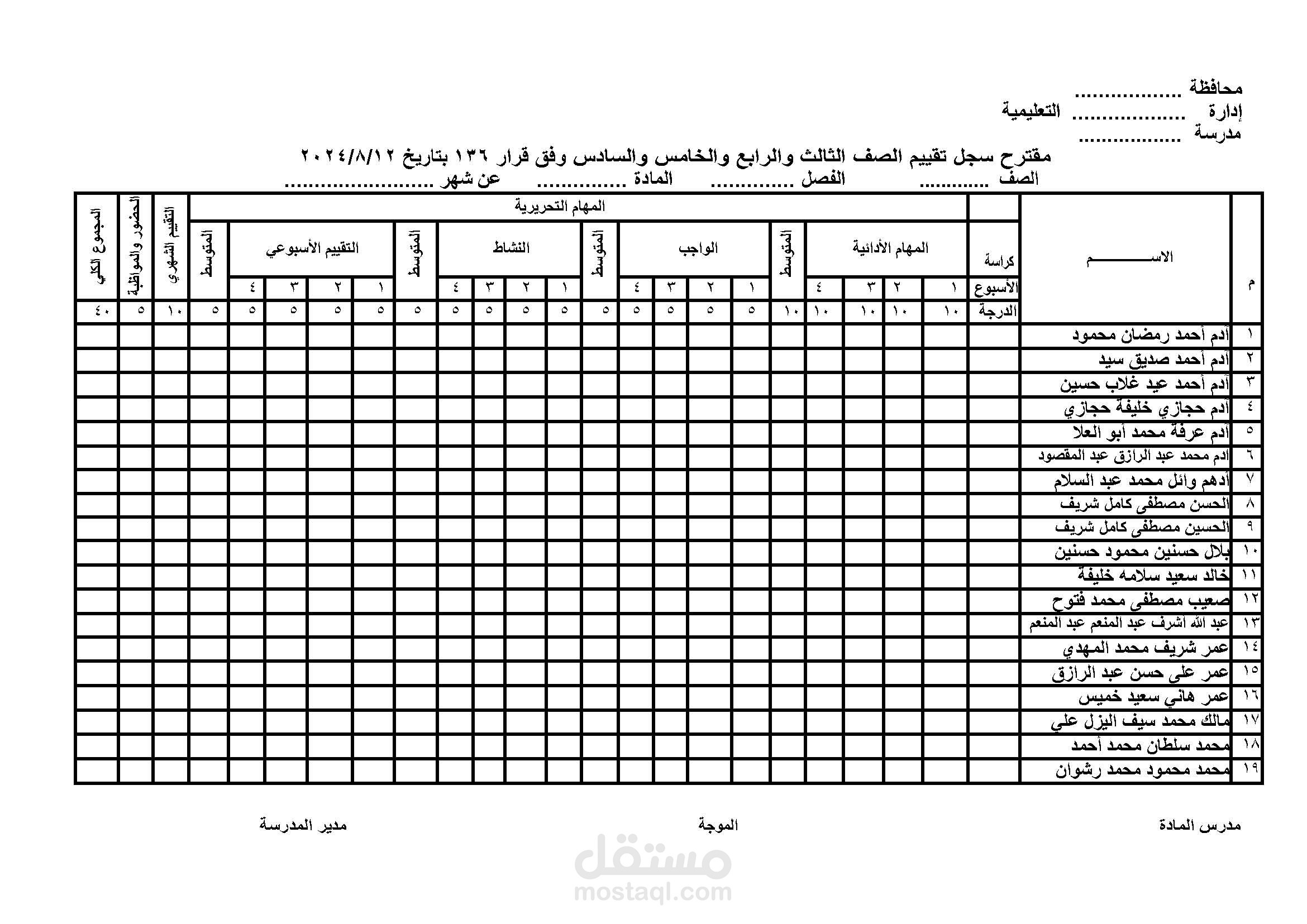جدول تقييم لصف مدرسي