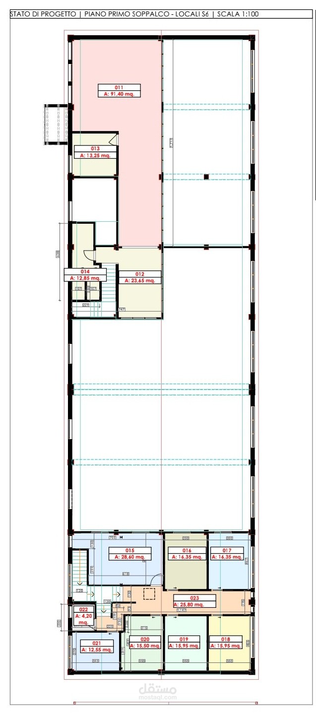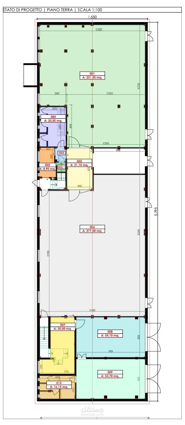 تصميم مبنى R+1 (15.50 م × 52.95 م) في 2D: