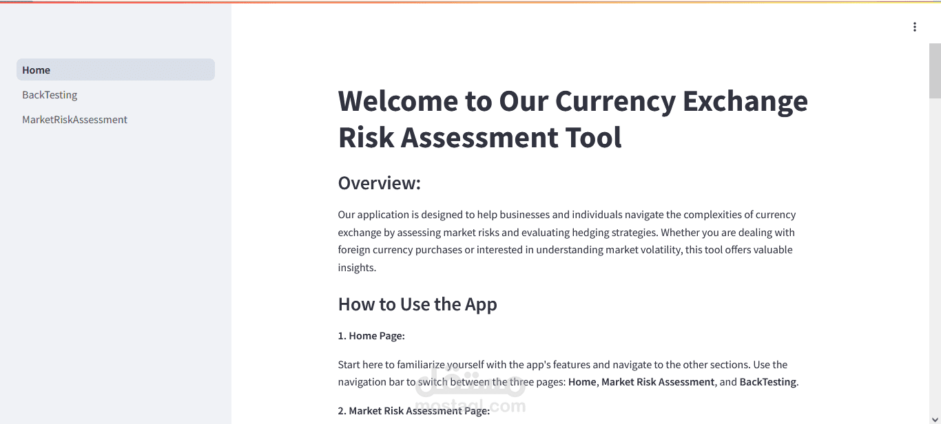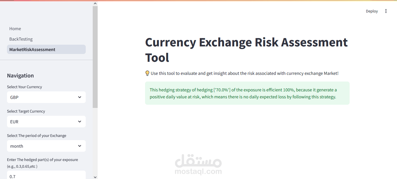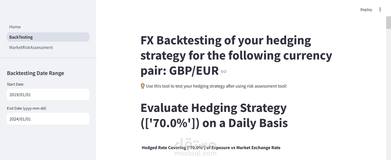 1- تطوير الأداة باستخدام Streamlit و Python: استخدمت Python لكتابة الأكواد التي تقوم بمعالجة البيانات التاريخية لسوق الفوركس وتحليل المخاطر. من خلال Streamlit، قمت بتطوير واجهة تفاعلية سهلة الاستخدام تتيح للعميل تعديل المتغيرات مثل أزواج العملات، حجم التعرض السنوي، ونسب التحوط المفضلة، مما يتيح له محاكاة استراتيجيات تحوط متعددة وعرض نتائجها بطريقة مرئية وسهلة الفهم.
