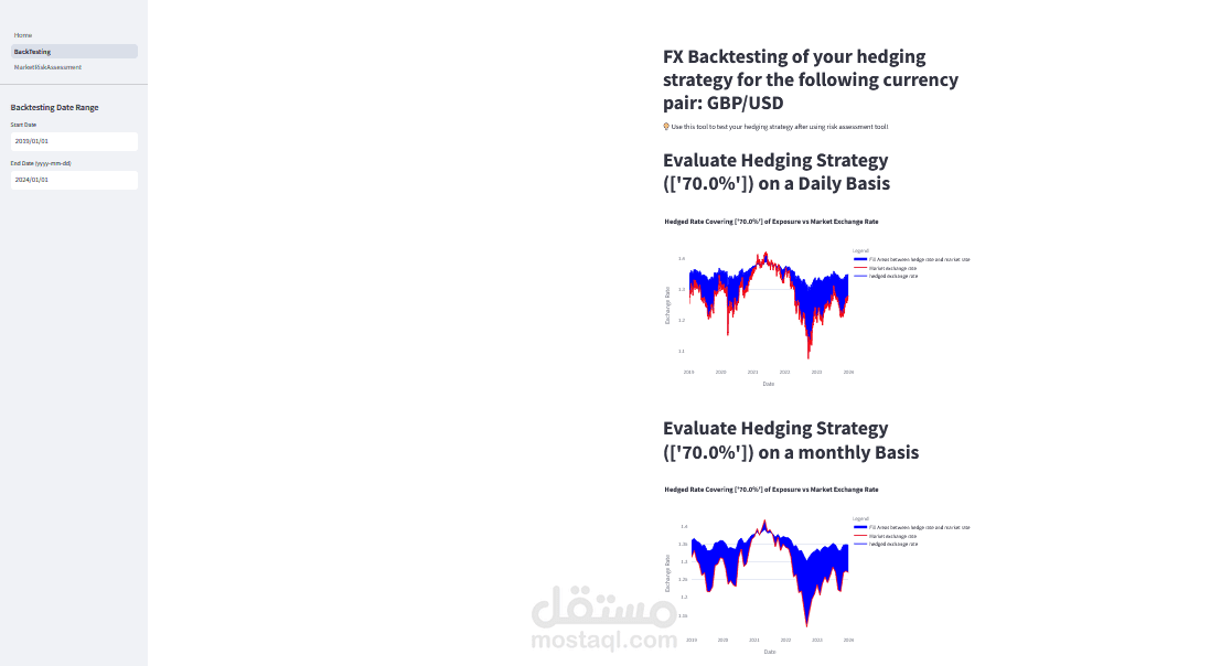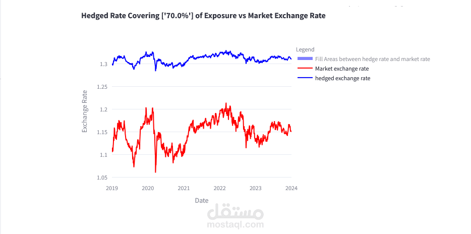 3-تحليل البيانات وتصميم التصورات التفاعلية: استخدمت Python لتحليل البيانات التاريخية لأزواج العملات (مثل GBP/USD) وحساب التباين والاختلافات في الأسعار. كما تم تصميم رسوم بيانية تفاعلية باستخدام Streamlit مثل الرسوم البيانية الخطية التي تعرض تأثير مختلف نسب التحوط على المخاطر، مما يساعد العميل على اتخاذ قرارات استنادًا إلى تصورات مرئية.