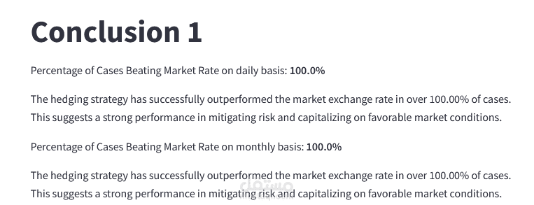 2-إضافة وظيفة اختبار الاستراتيجيات (Backtesting): تم تضمين وظيفة الاختبار الرجعي (Backtesting) ضمن الأداة باستخدام Python لتحليل أداء استراتيجيات التحوط عبر البيانات التاريخية. هذا مكن العميل من تقييم كيف كانت ستؤدي استراتيجيات التحوط المختلفة في الماضي، مما ساعده في اتخاذ قرارات أفضل بشأن التحوط في المستقبل.