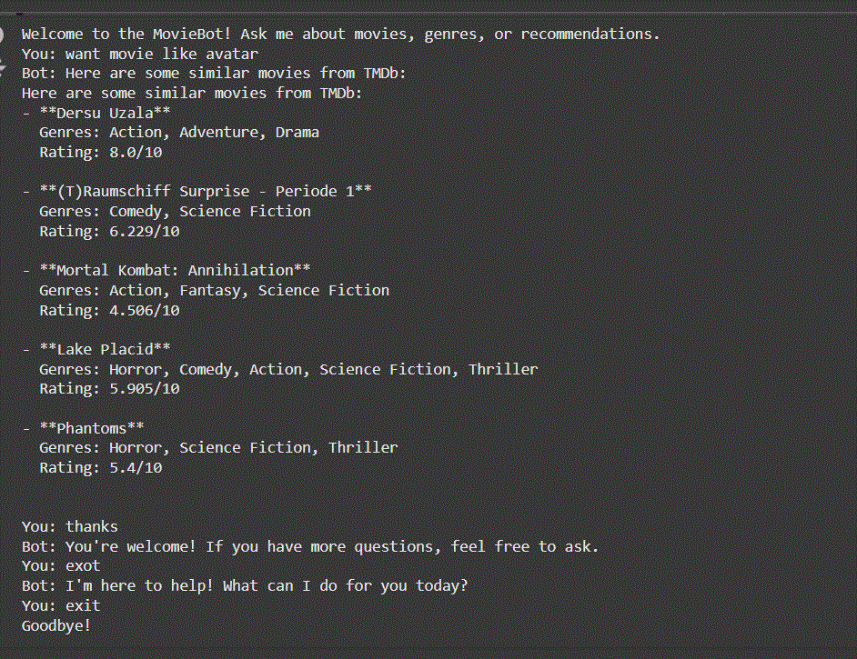 حساب تشابه Cosine Similarity بين تمثيل الفيلم المدخل وتمثيلات الأفلام الأخرى لتقديم توصيات مشابهة.