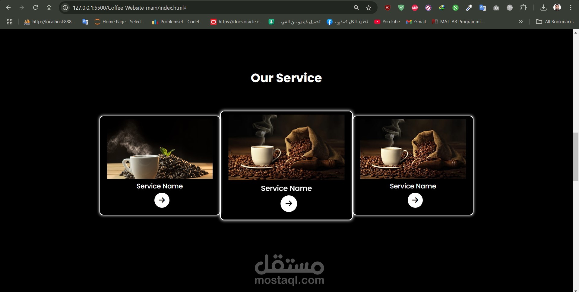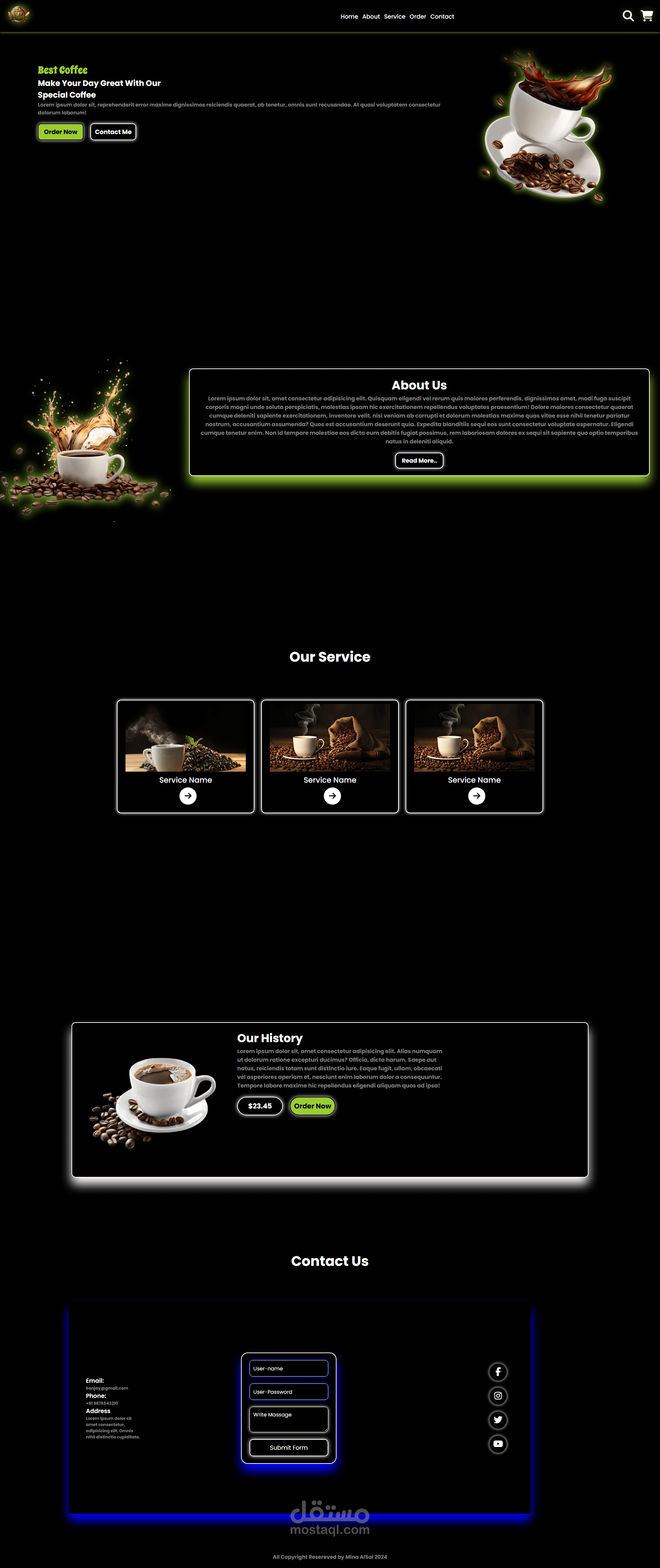 خدماتنا (Our Service): صفحة تعرض خدمات المقهى أو العلامة التجارية مثل تقديم القهوة، خدمة التوصيل، أو الفعاليات الخاصة.