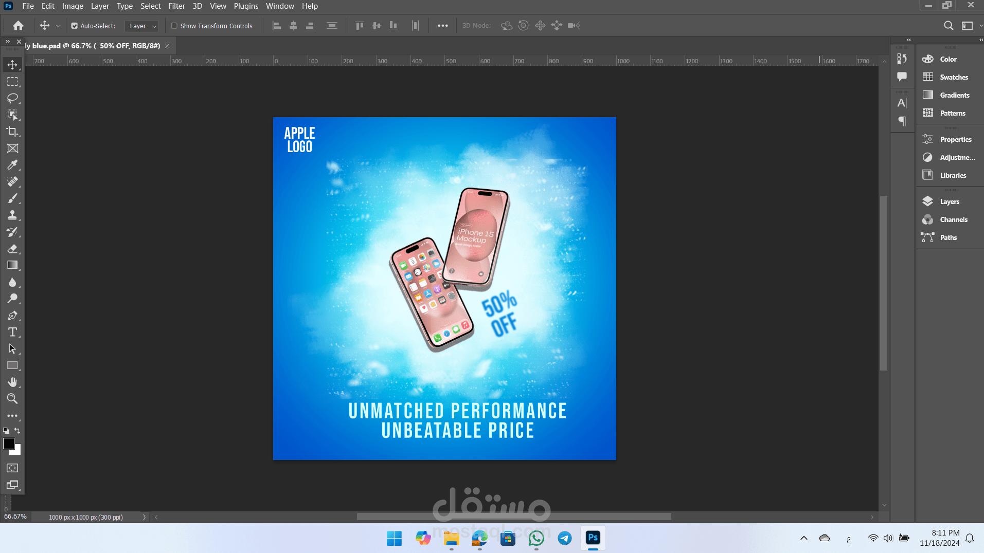 التصميم يسلط الضوء على عرض ترويجي لهاتف iPhone 15، مع شعار Apple في الزاوية العليا، وخلفية باللون الأزرق النابض بالحياة. يظهر الهاتف بتصميم أنيق، مع عرض "خصم 50%" بشكل بارز، وشعار في الأسفل يؤكد على الأداء المميز والسعر غير القابل للمنافسة.