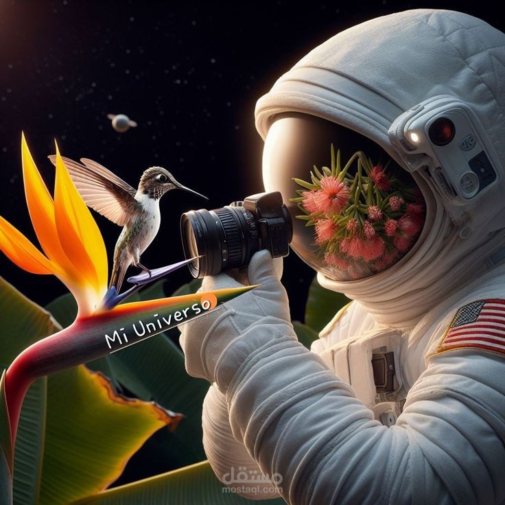 JavaScript: Depending on functionality (like animations or interactive elements hinted at by the "Switch Intro" button), Image Sourcing: The background image — a sophisticated composite of an astronaut, hummingbird, and flower — was sourced.