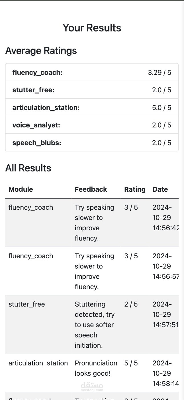 المشروع ده نجح في تقديم تطبيق تفاعلي لتدريب وتحسين الطلاقة في الكلام عن طريق تحليل صوتي لحظي وملاحظات فورية. حلينا مشاكل توافق التنسيقات، ودمجنا أدوات تحليل الصوت مع تصميم تجربة مستخدم بسيطة. ده خلا التطبيق وسيلة فعّالة لمساعدة المستخدمين على تحسين كلامهم ببرنامج تدريبي متكامل