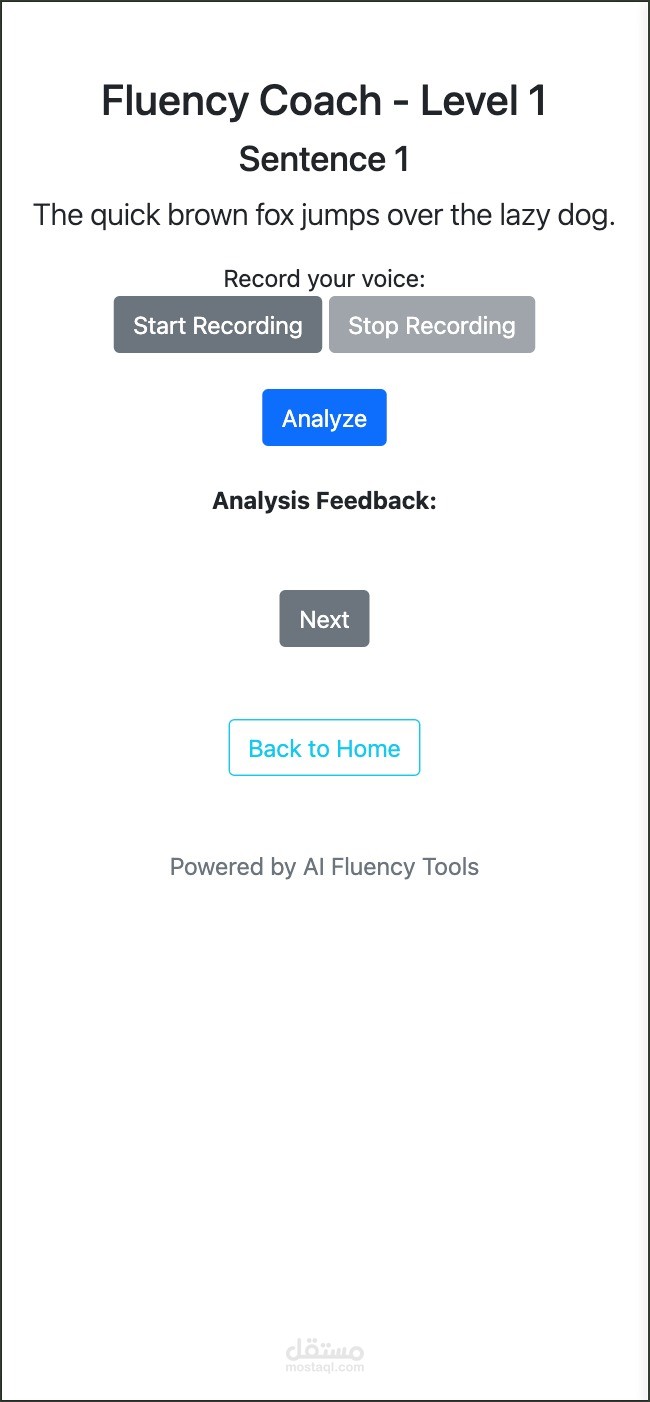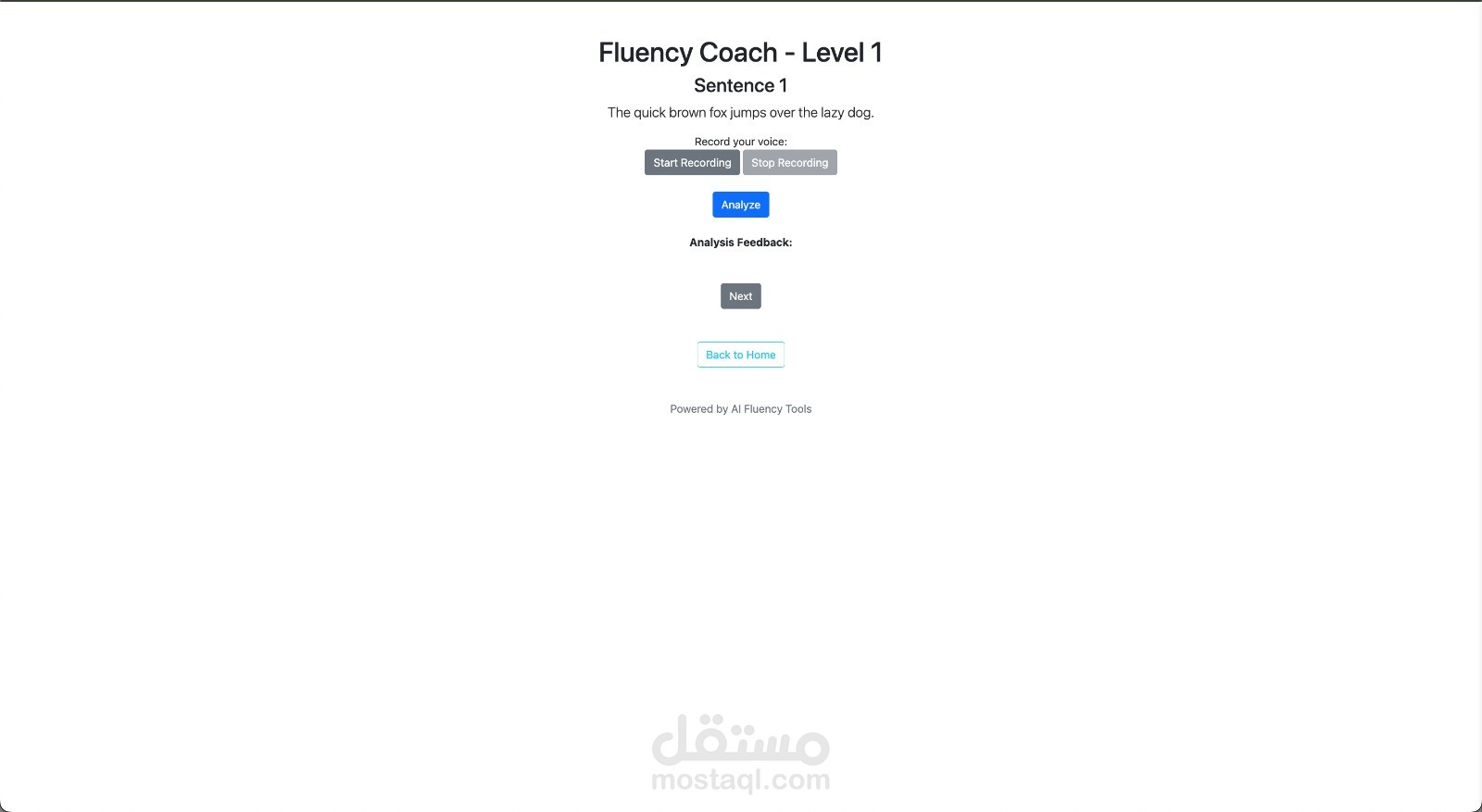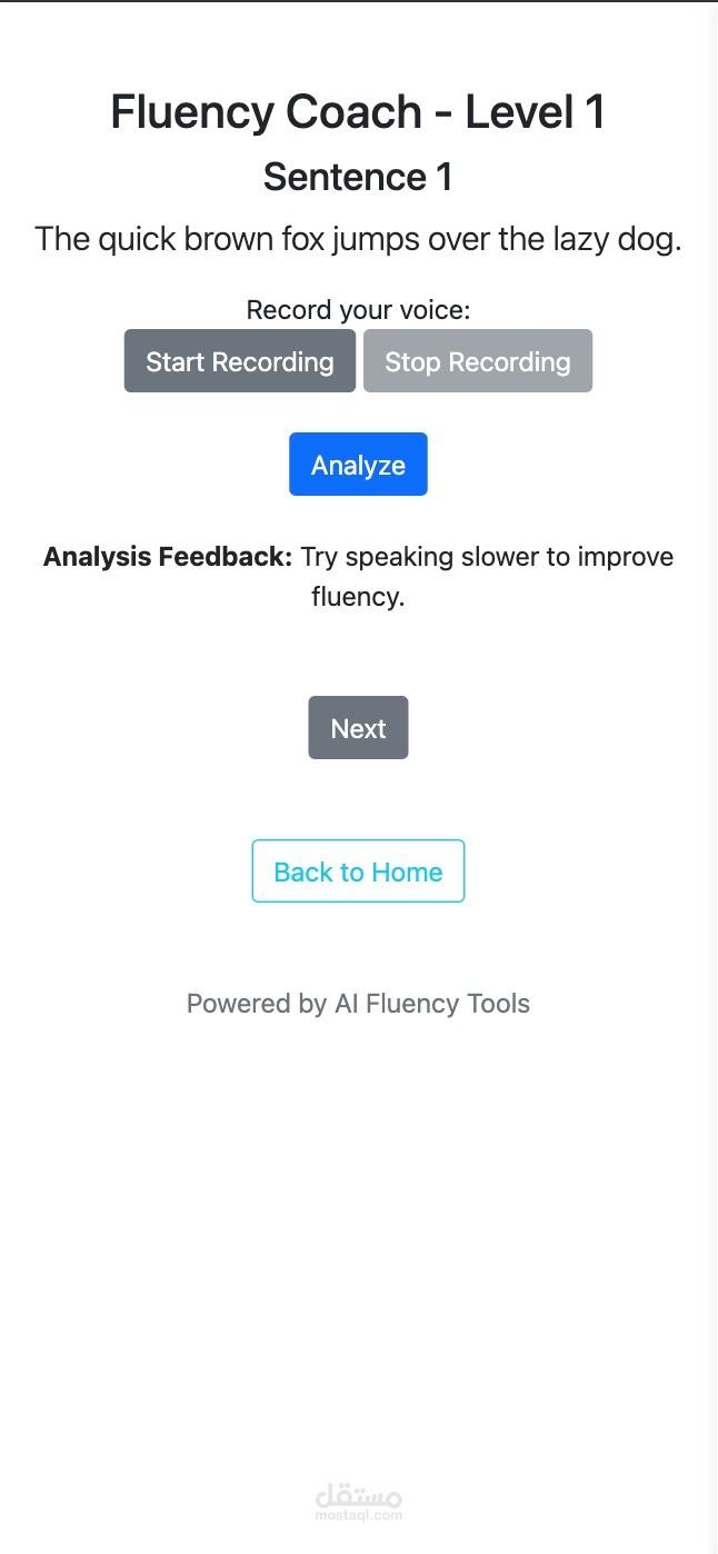 المشروع ده عبارة عن تطبيق ويب تفاعلي يساعد المستخدمين على تحسين طلاقتهم في الكلام، تقليل التلعثم، وتحسين النطق باستخدام أدوات تحليل صوت متقدمة