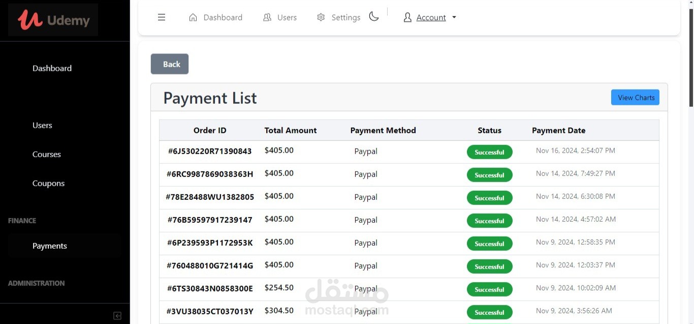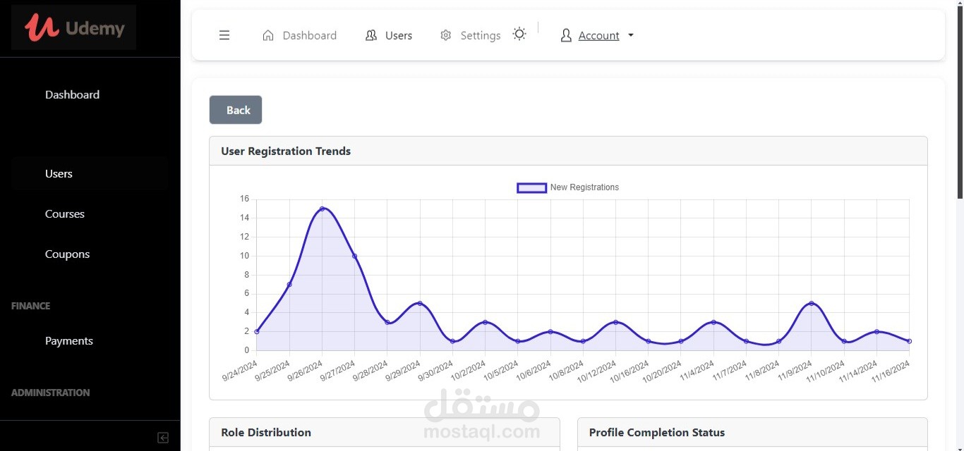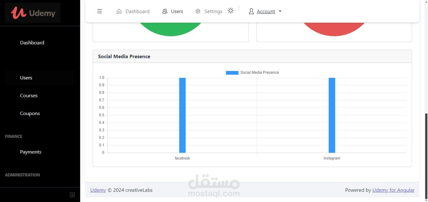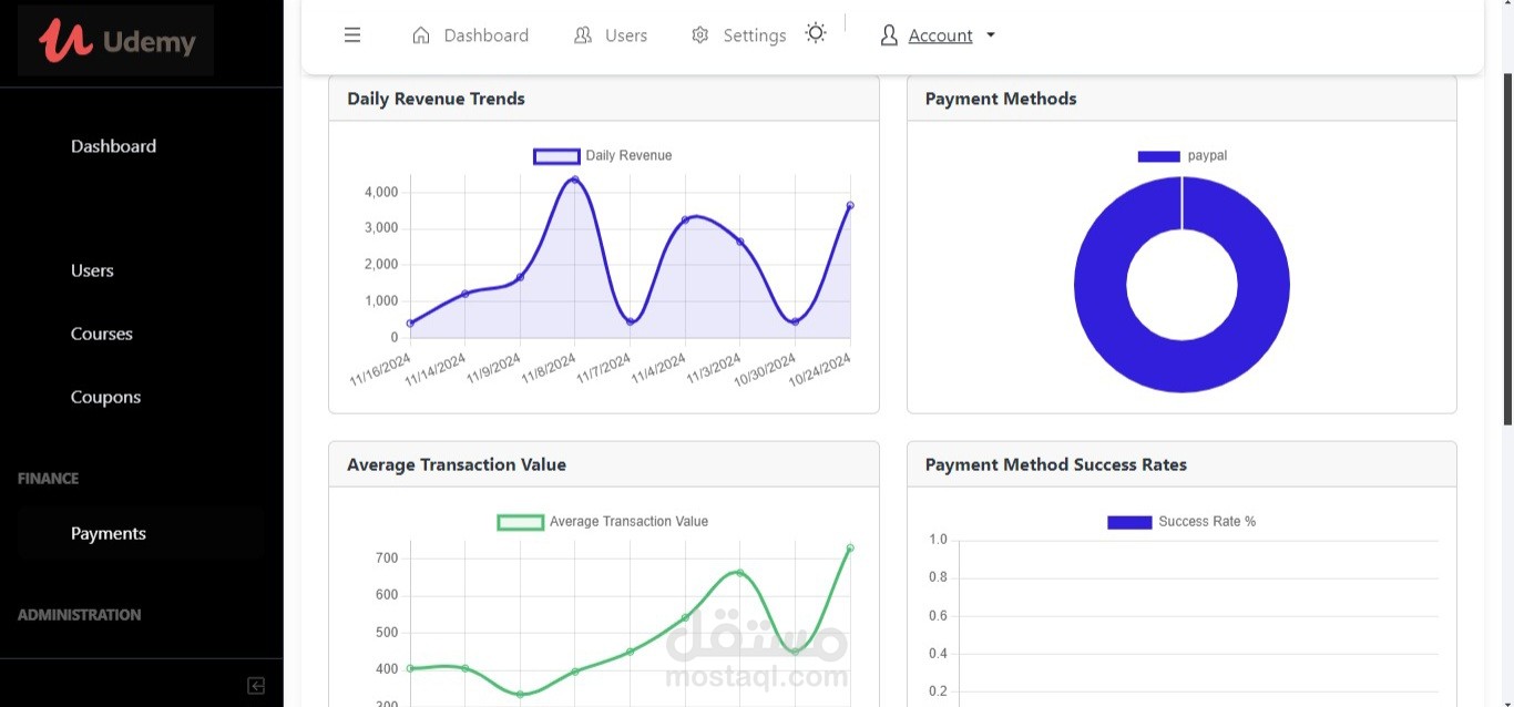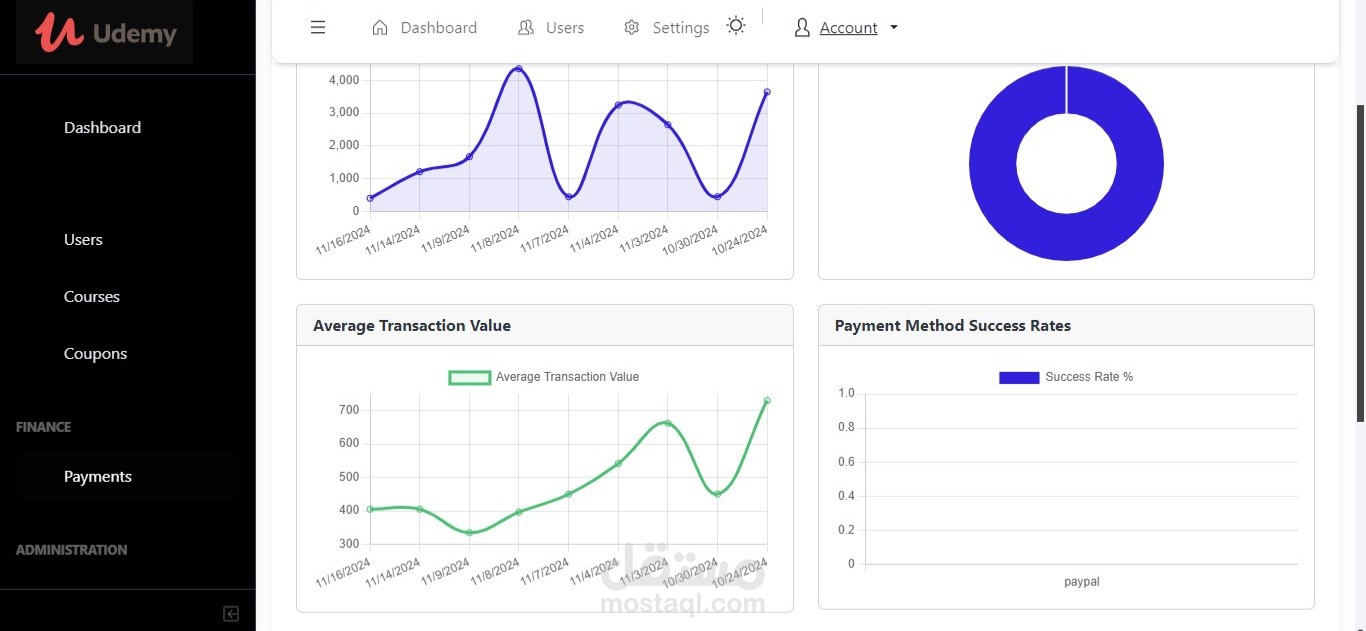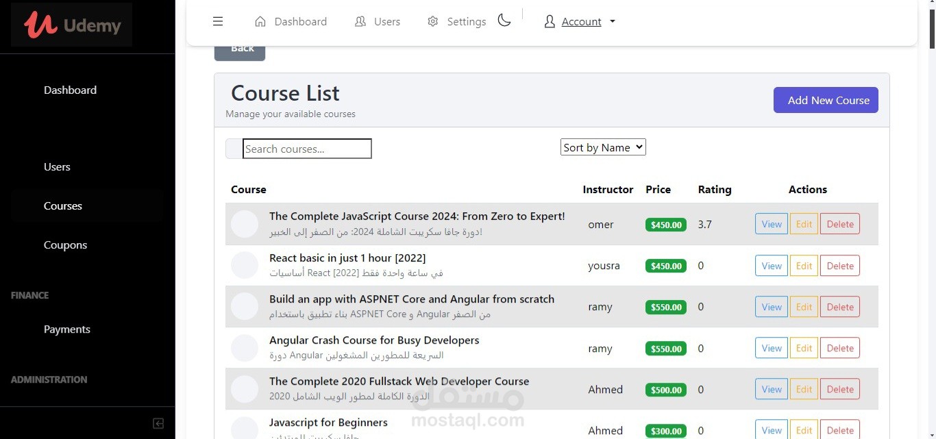 "قمت بتطوير لوحة تحكم (Dashboard) باستخدام Angular لإدارة منصة تعليمية شبيهة بـ Udemy، مع واجهة مستخدم سهلة الاستخدام وتصميم متجاوب يدعم جميع الأجهزة.